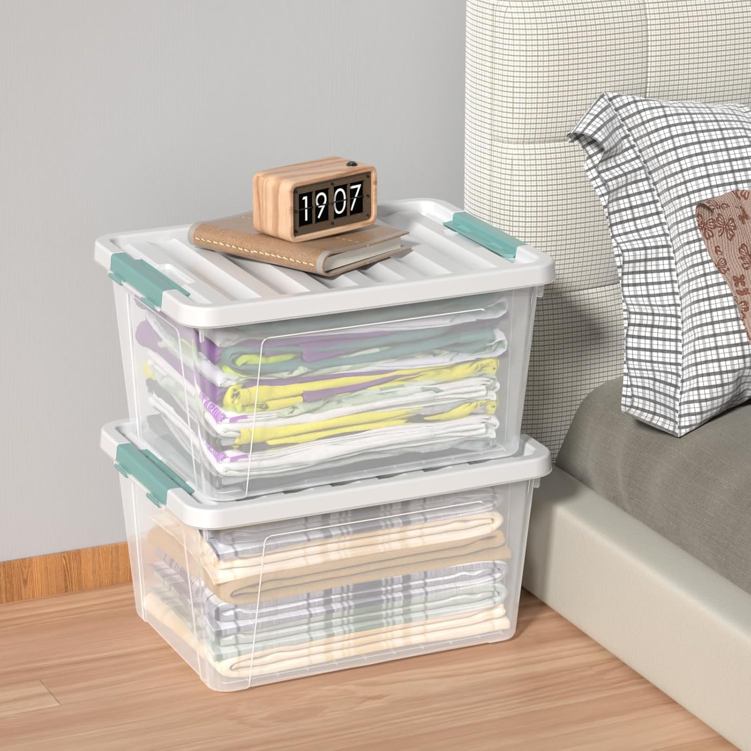 - A set of 6 35 quart transparent plastic boxes, perfect for sorting and organizing your personal belongings
