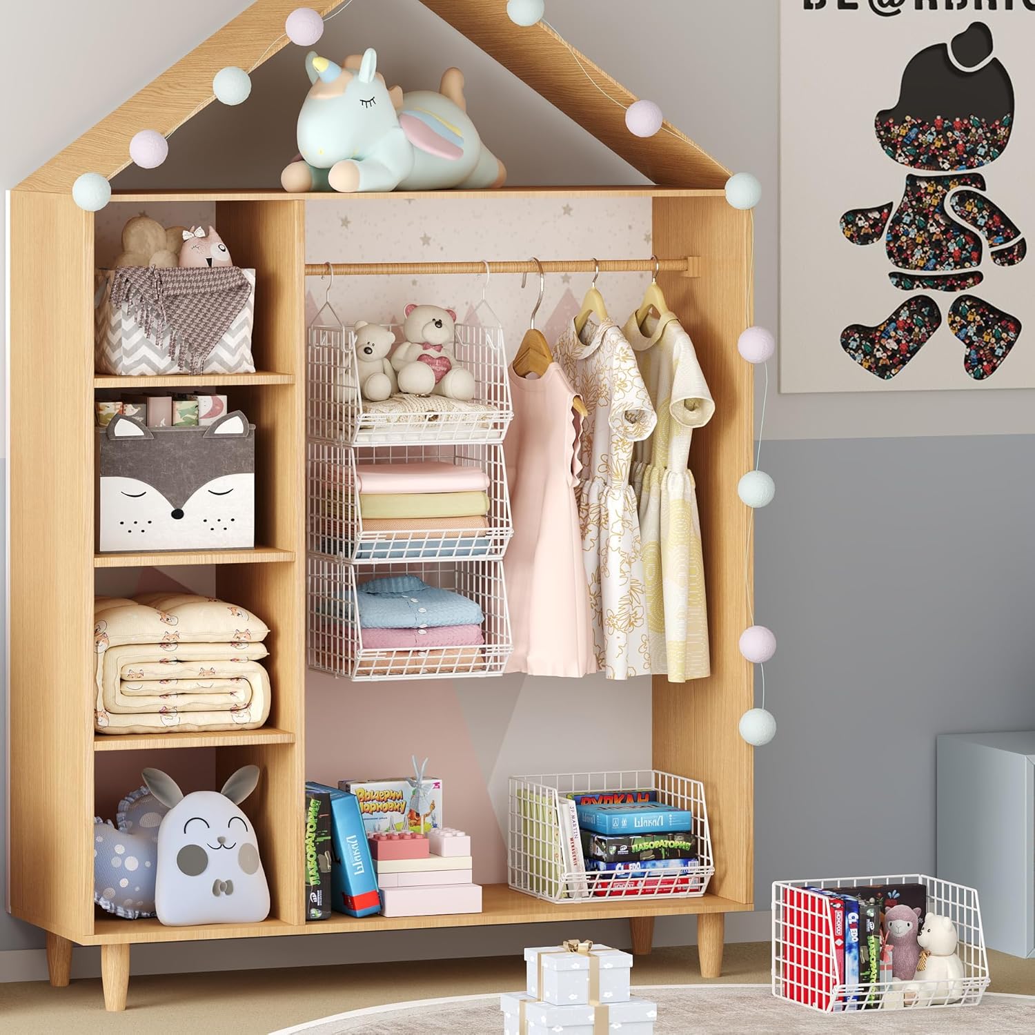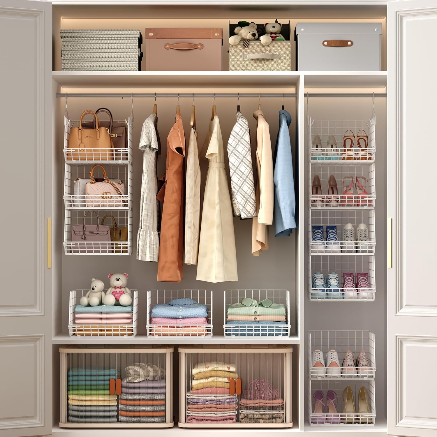 - Perfect Storage Organization: 4 tier wide open wire basket allows you to easily view, put in and take off more easily. X-cosrack metal basket hanging shelves provide a great storage solution for any room in the home. Organize clothes accessories and toys in your closet, lotions in your bathroom, containers in your pantry, office supplies, mails in your office, fruit&vegetable&spices in your kitchen.