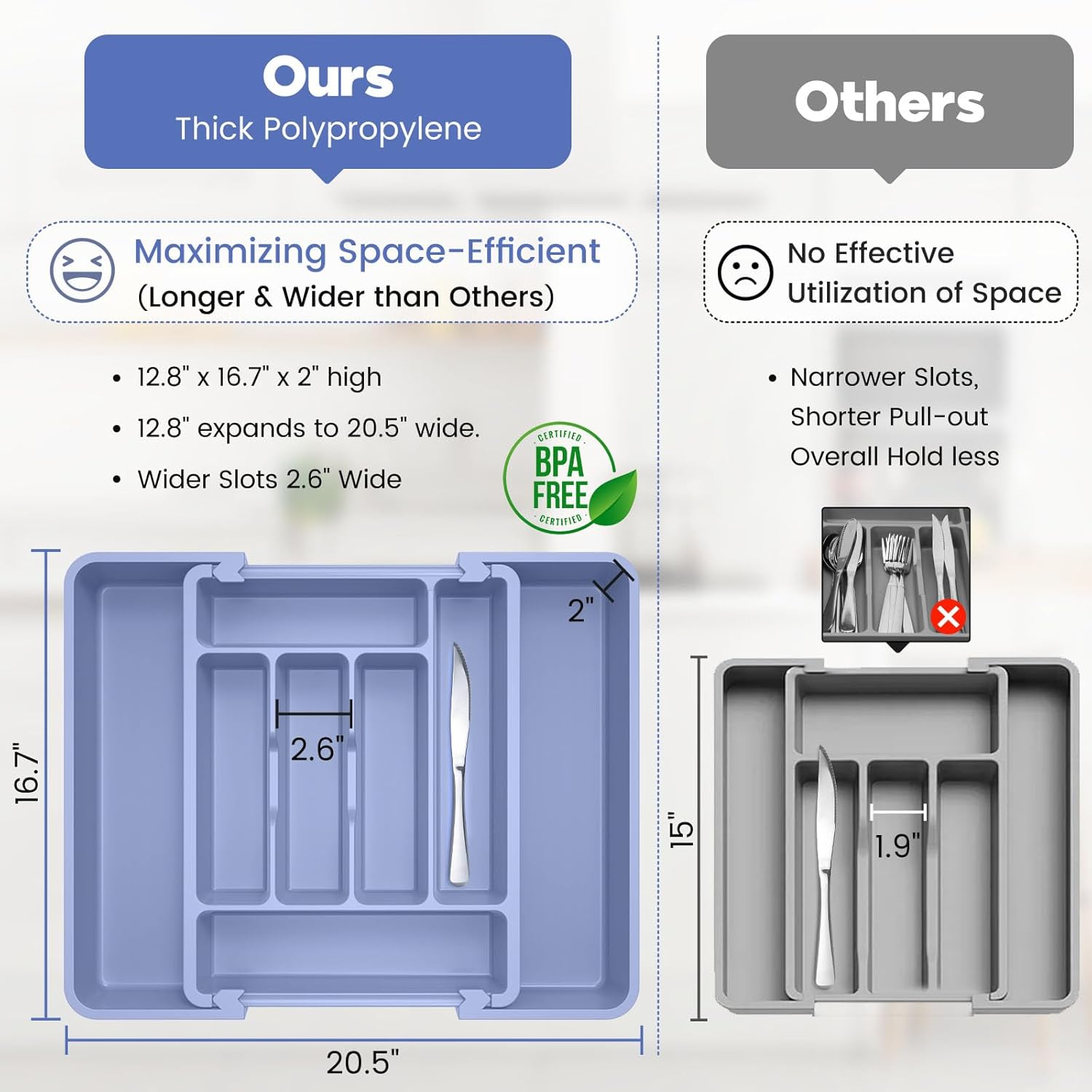 Caperci Large Silverware Organizer for Kitchen Drawer & Utensils - Expandable Drawer Organizer for Cutlery, Flatware & Gadget, BPA-Free Thick Plastic, Wider Compartments & Non-skid Feet (Breezy Blue)