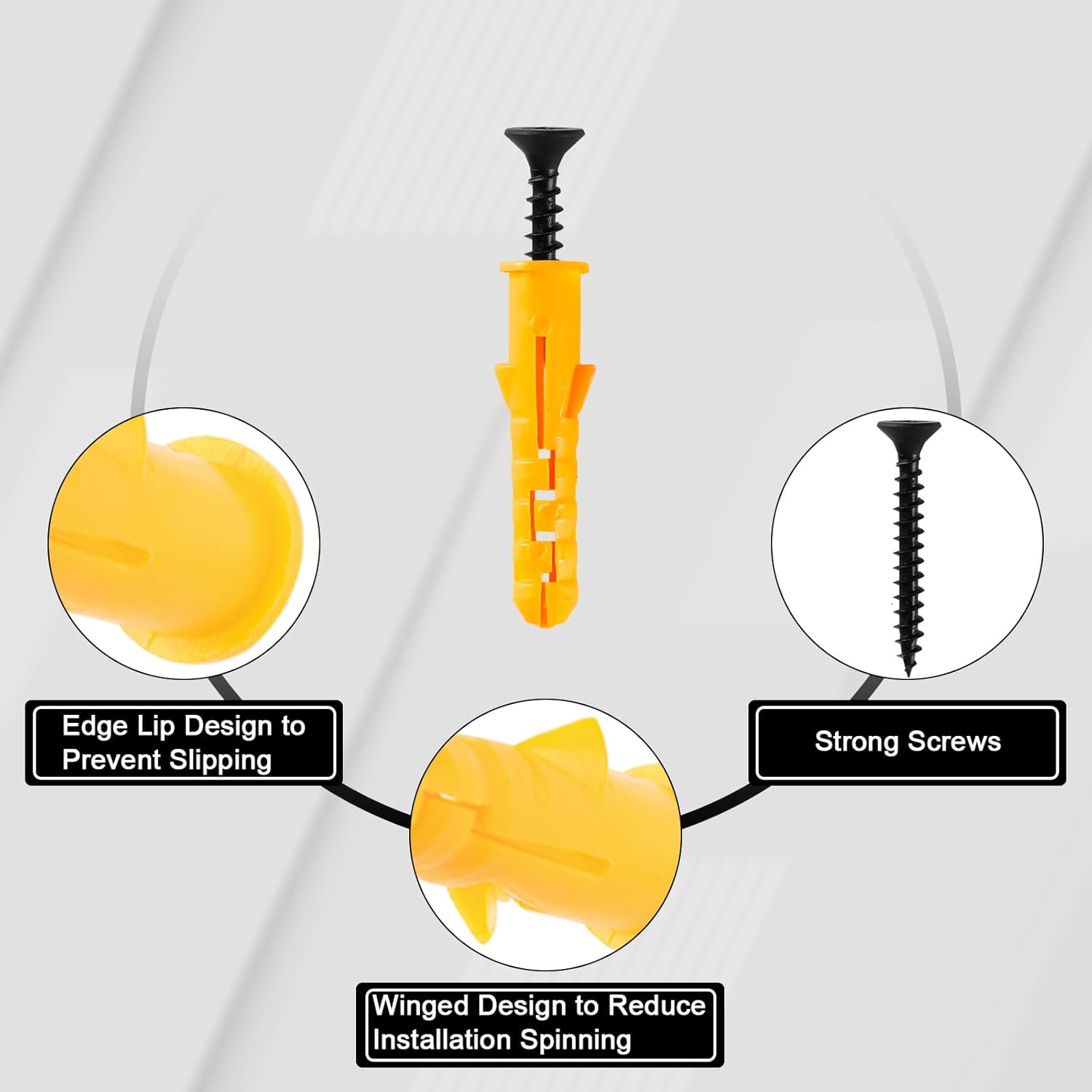 - STRONG HOLD WITH RELIABLE MATERIALS – Designed for secure mounting, the ribbed wall anchors are made from high-quality nylon and PE composite, providing enhanced strength and resistance to wear. The Philips wood screws are crafted from galvanized high-carbon steel, offering excellent resistance to rust and corrosion. Together, they create a firm hold, preventing slippage and ensuring a stable installation on various surfaces.