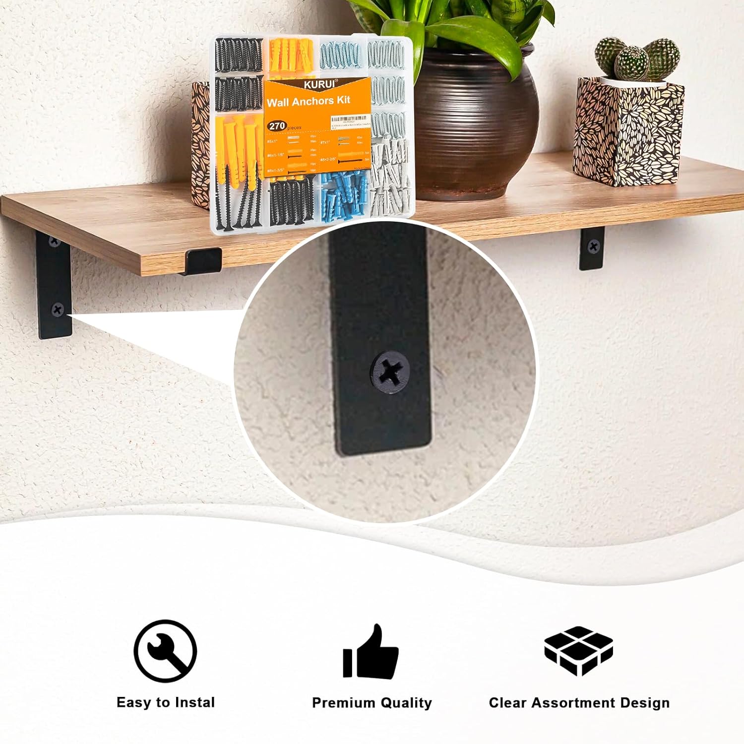 KURUI Wall Anchors Kit for Hanging Wall Art Decor, 270Pcs Picture Hangers Assortment Kit for Drywall Concrete Brick, 135 Screws and 135 Drywall Anchors,Replace Picture Hanging Nails for Frame Tapestry