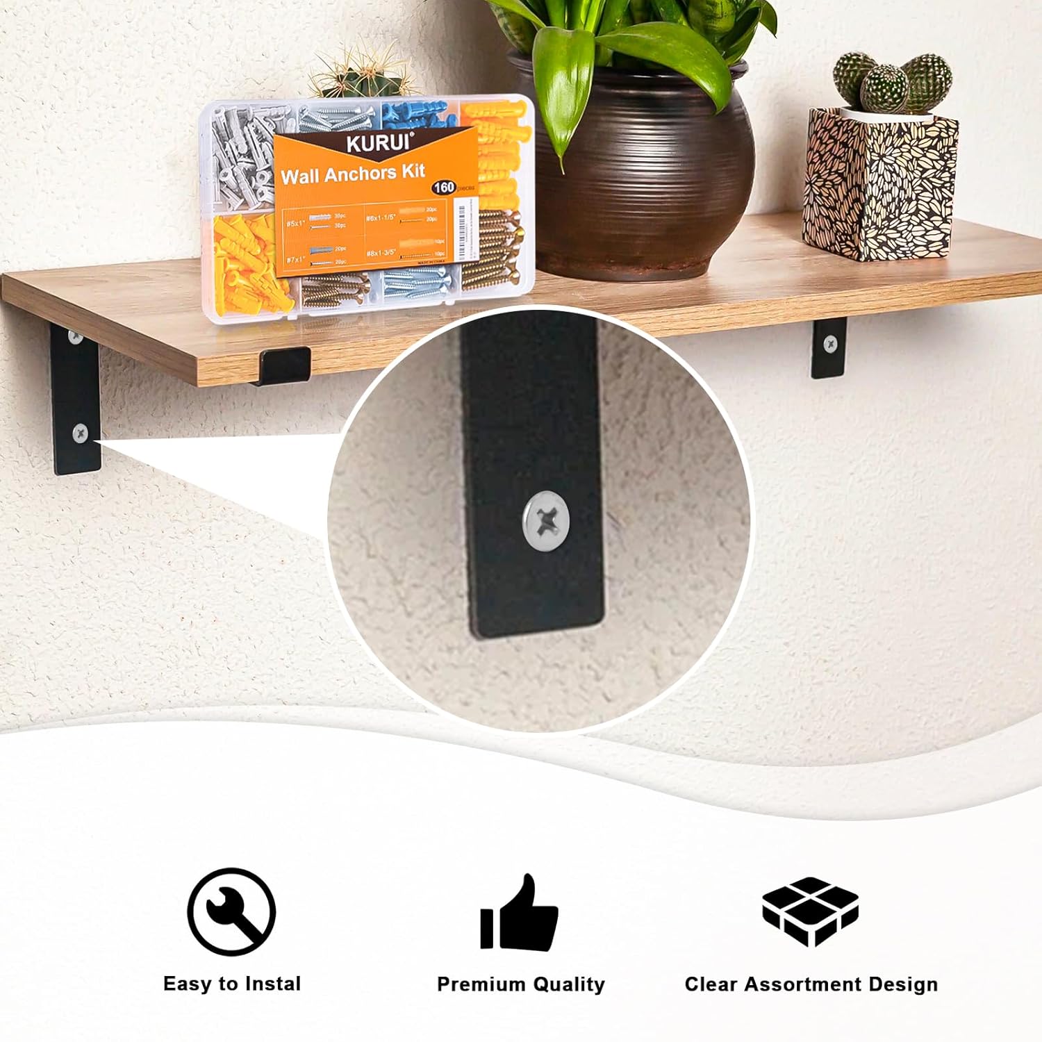 KURUI Wall Anchors Kit for Hanging Wall Art Decor, 160Pcs Drywall Anchors Assortment Kit for Frame Shelf Decorations, Plant Hooks, 135 Screws and 135 Plugs, Picture Hangers for Drywall Concrete Brick