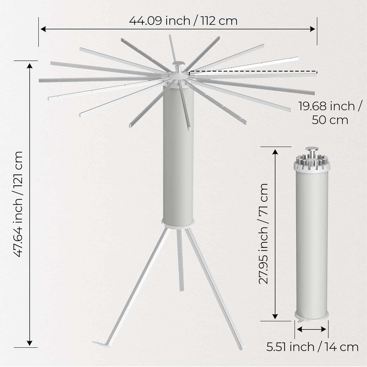 - 【Sturdy and Durable】The clothes drying rack has 16 rods and a strong tripod structure that can support up to 45 pounds of clothing; Depending on your needs for space and usage needs, you can increase the number of arms you require.The folding drying rack's unique tripod design allows it to remain perfectly stable in a limited area.
