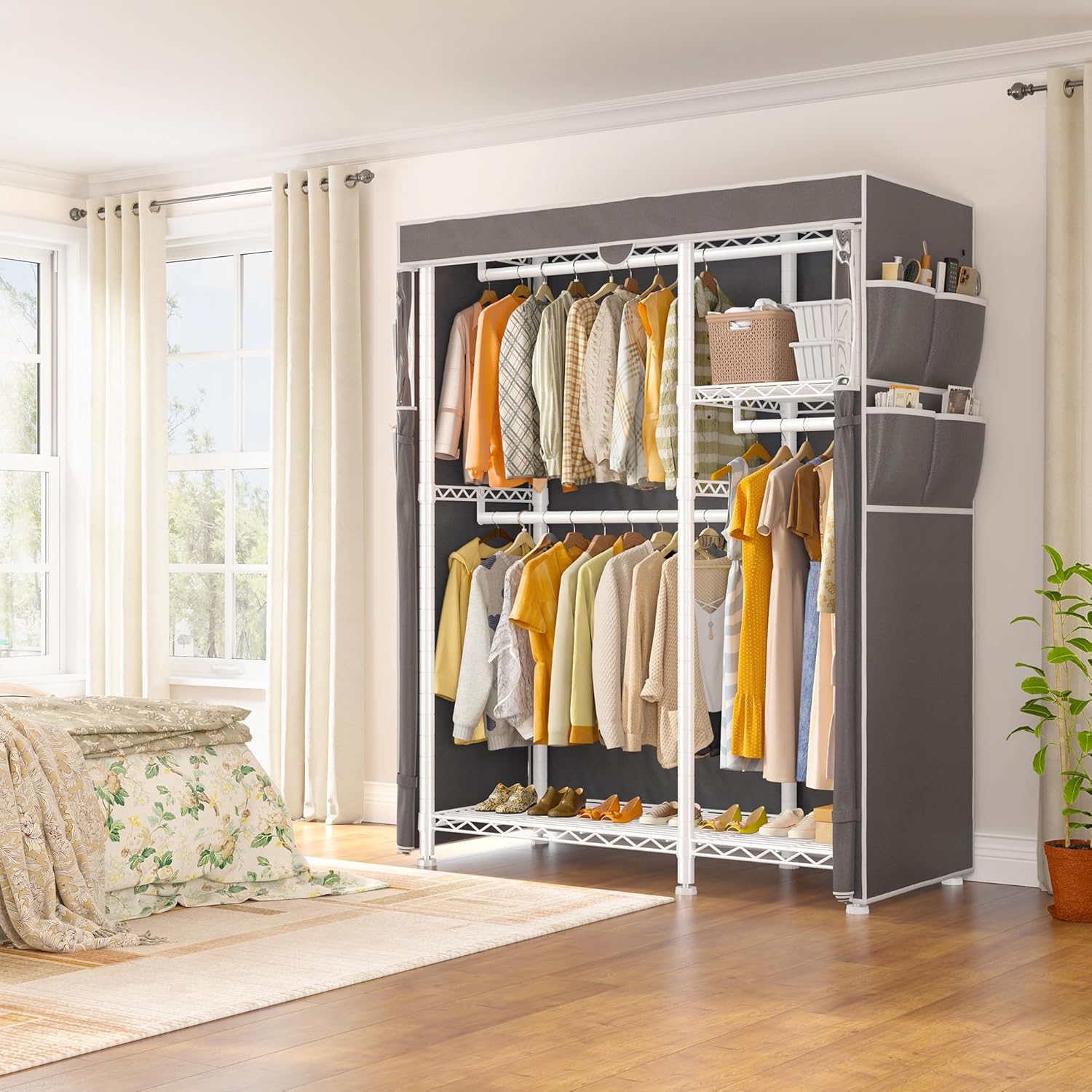 - Clothes Rack with Multifunctional Cover for Protection:The premium fabric of the rack is twice as thick as the others, ensuring that the clothing rack will last a long time. The all around coverage protects clothes from pets, sunlight and water.There are four pockets on each side of the covered garment rack, which provide additional storage space for stuff, like a hair dryer.