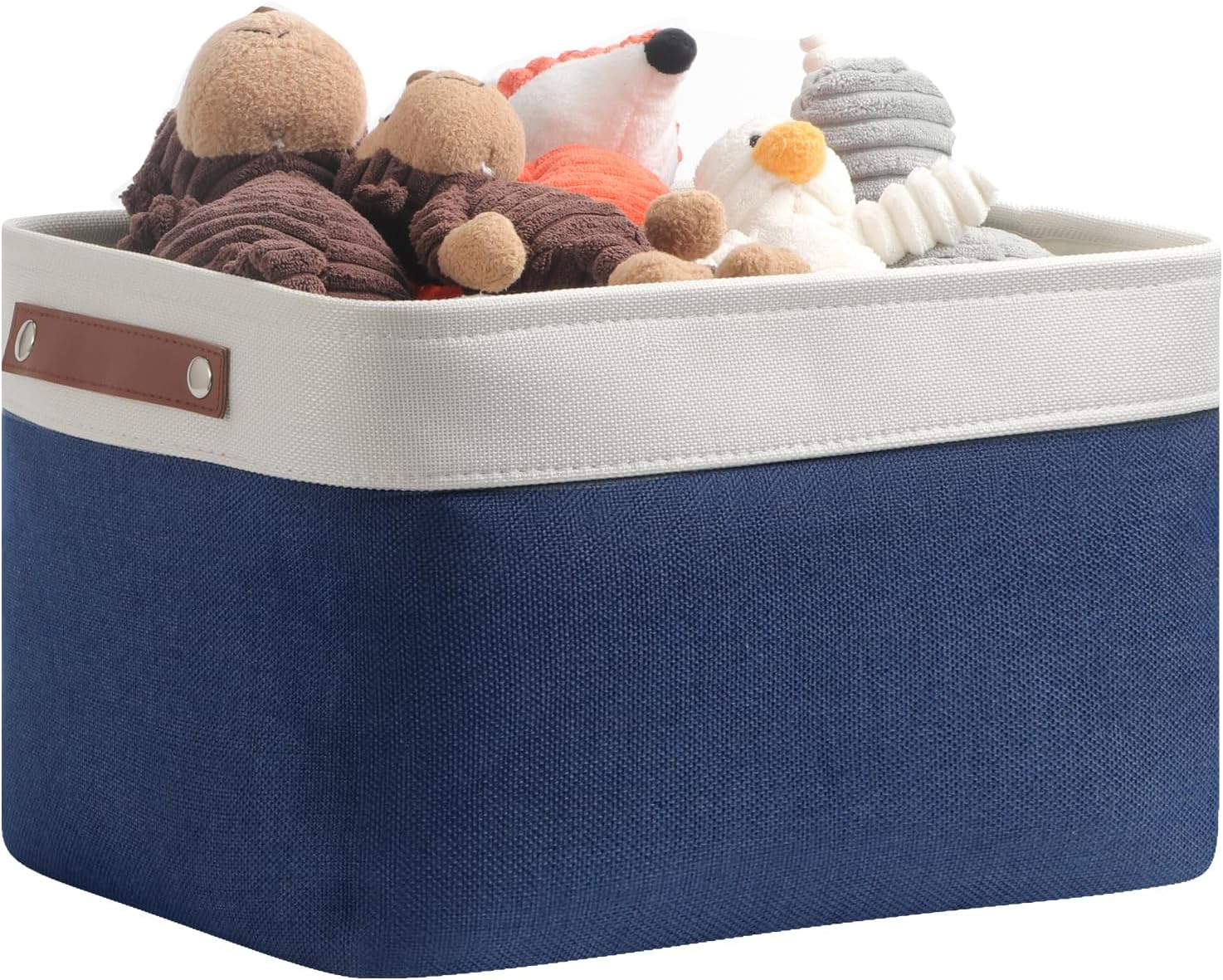 DULLEMELO Fabric Storage Basket for Closets,15x11x9.5 inch Foldable Storage Basket Bin with Handles for Office, Closet,Bedroom (White&Blue,1 Pack)