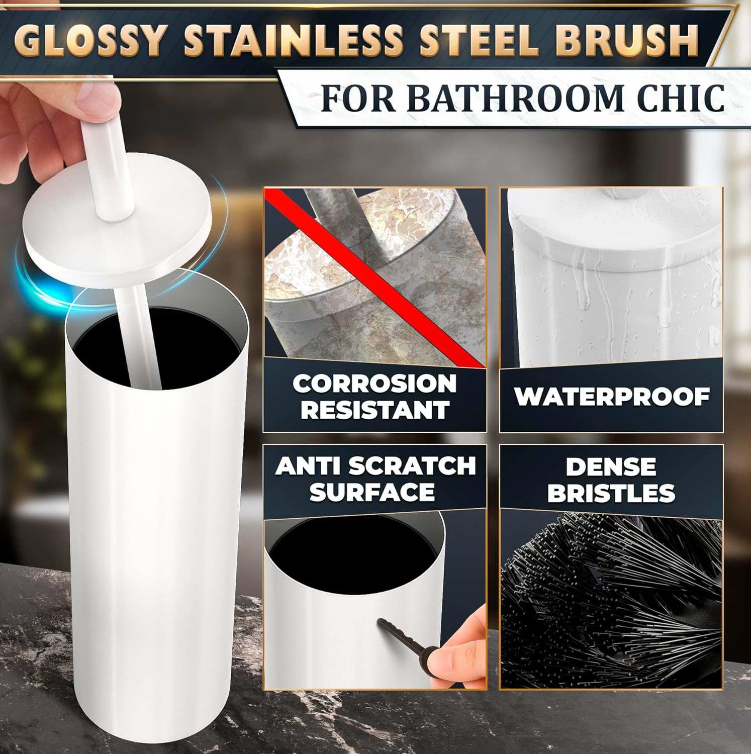Stainless Steel Toilet Brush and Holder Set White - Long Handle Toilet Bowl Cleaner Brush and Holder - Removable Inner Liner, Shiny Design, Splash Protection & Dense Bristles for Bathroom Cleaning