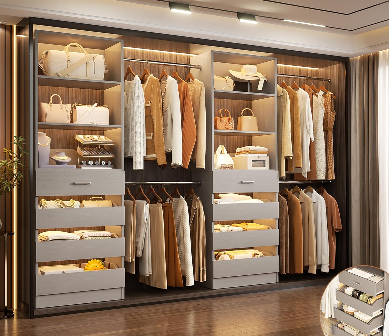- Aheaplus Closet System, 6-15Ft Closet Organizer with 8 Wooden Drawers, Wood Closet Organizer System with Tower, Walk-in Closet Organizer Wardrobe Garment Clothes Rack with 4 Hanging Rods, White Oak