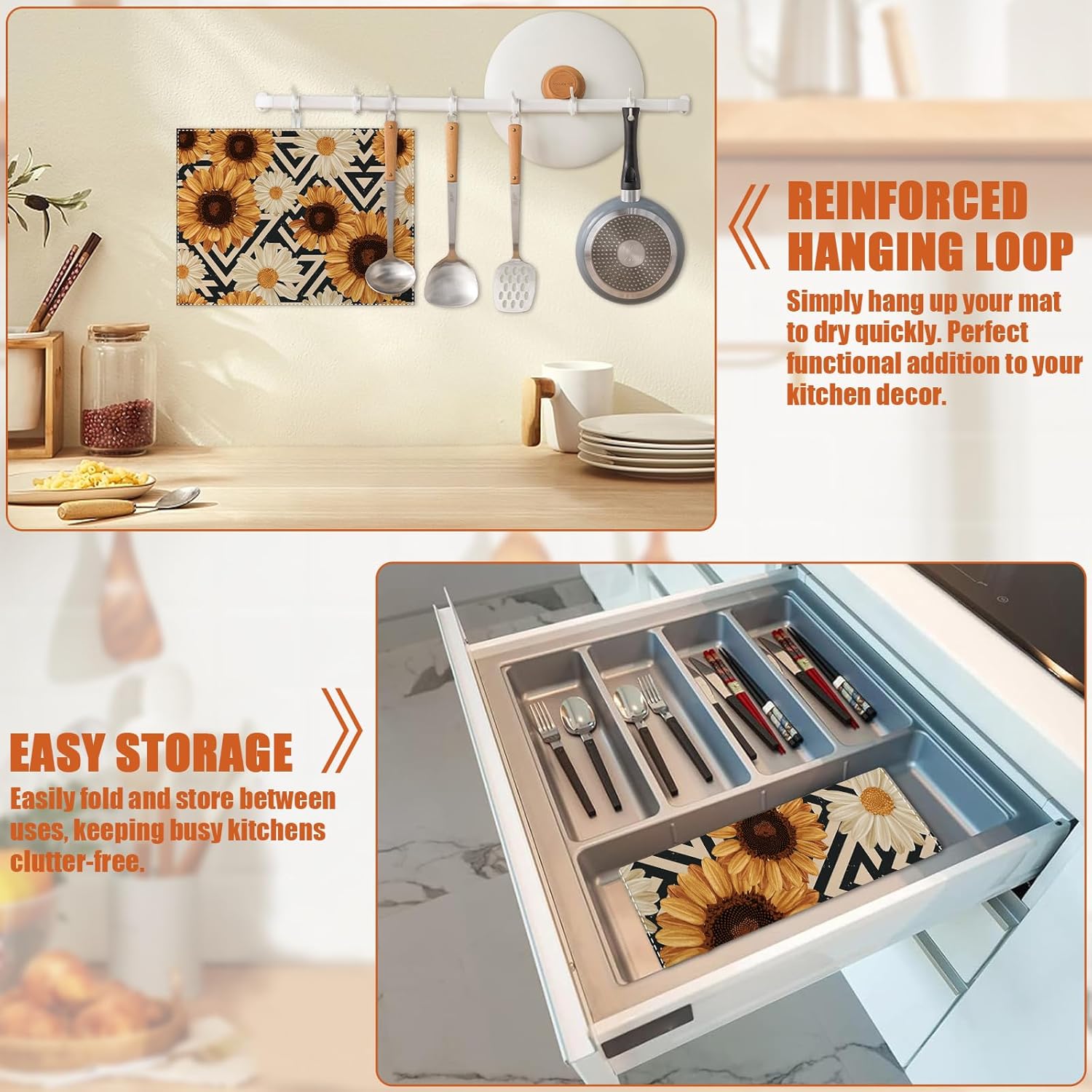 Vintage Sunflower Daisy Dish Drying Mat for Kitchen Counter Microfiber Absorbent Dish Kitchen Drying Mat Draining Reusable Washable for Dishes/Utensils/Counterto