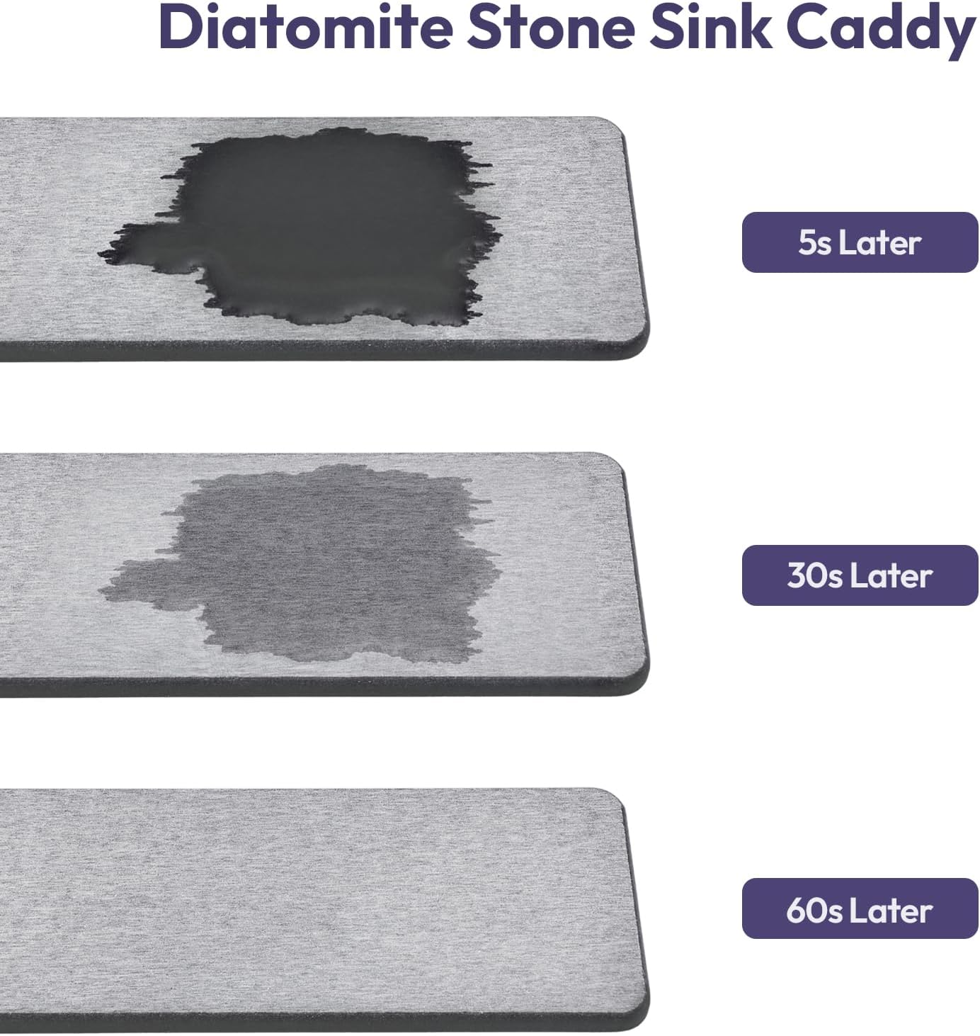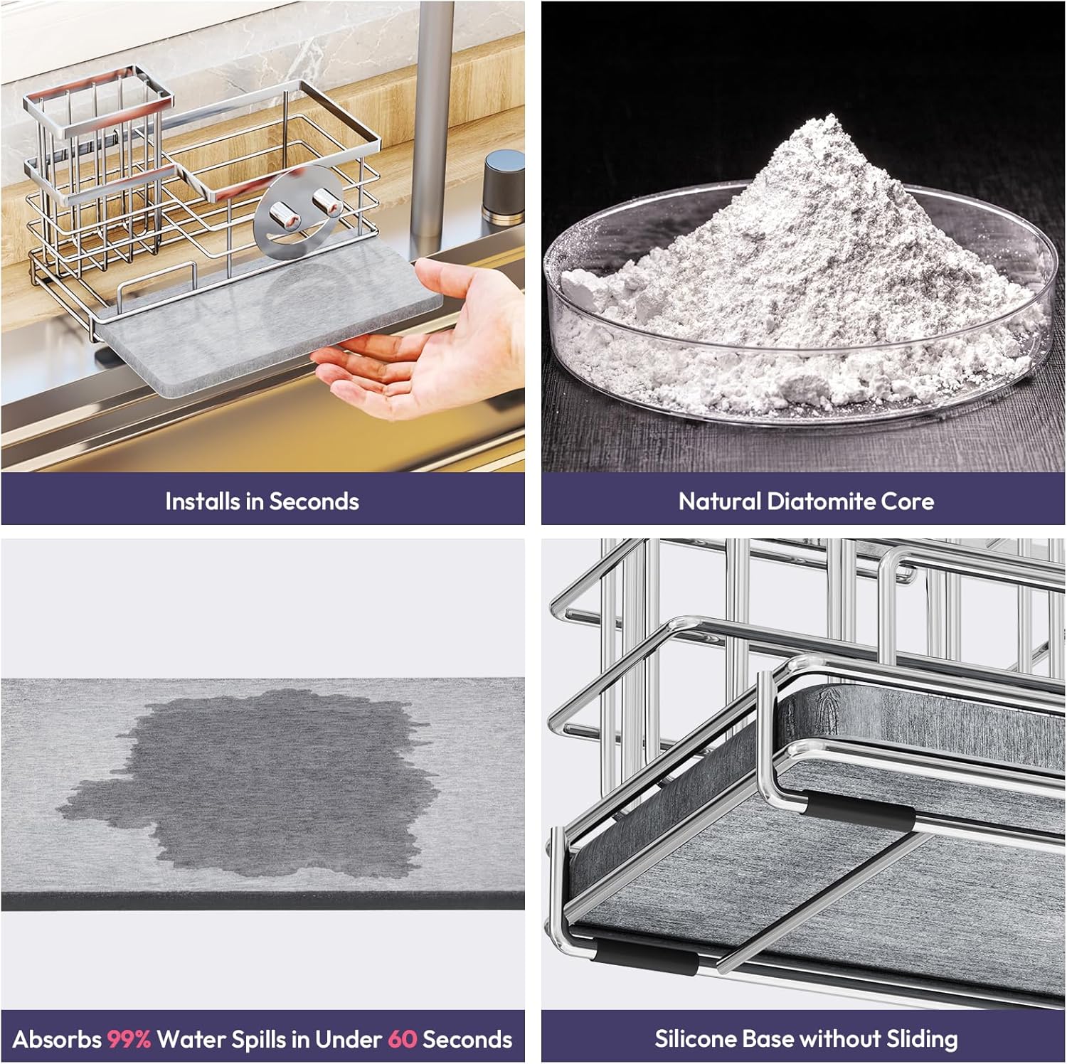 - [Instant Drying with Diatomite Pad] : Unlike typical sink caddy kitchen sink organizer, this sponge holder features a fast-absorbing diatomite drying pad that eliminates standing water within 60 seconds