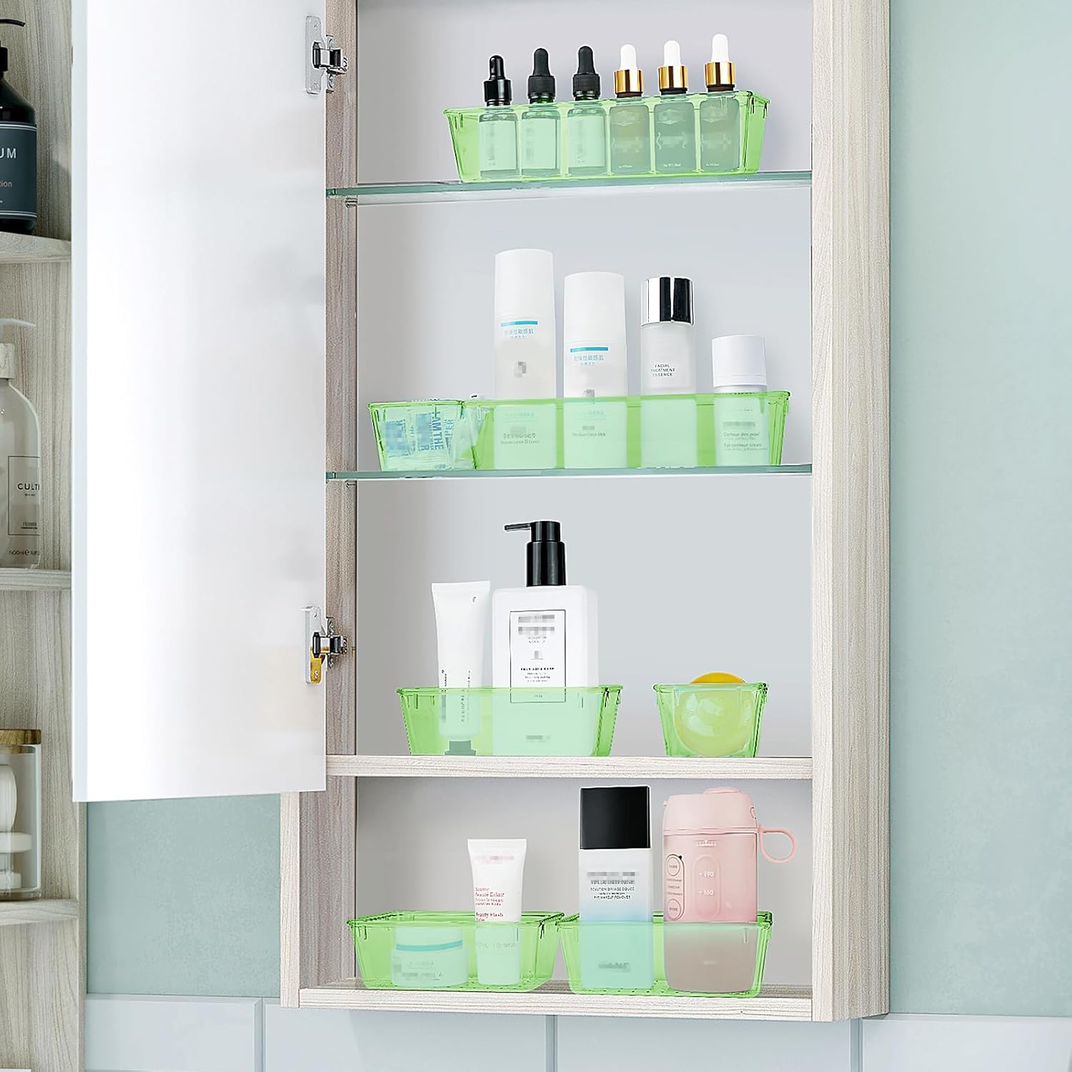 WOWBOX 25 PCS Plastic Drawer Organizer Set, 4 Sizes Desk Drawer Divider Organizers and Storage Bins for Makeup, Jewelry, Gadgets for Kitchen, Bedroom, Bathroom, Office, Clear Green