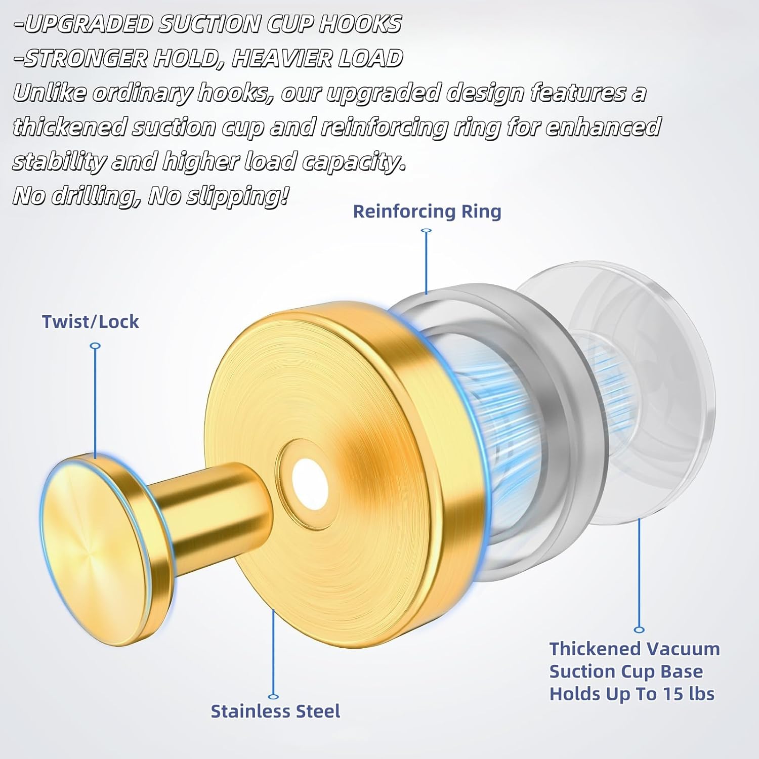 2025 Upgraded Stainless Steel Heavy Duty Suction Cup Hooks for Shower Bathroom Accessories Removable Hook for Glass Window Door Wall Hooks for Hanging Towels Robes Wreaths (Pack of 2, Gold)