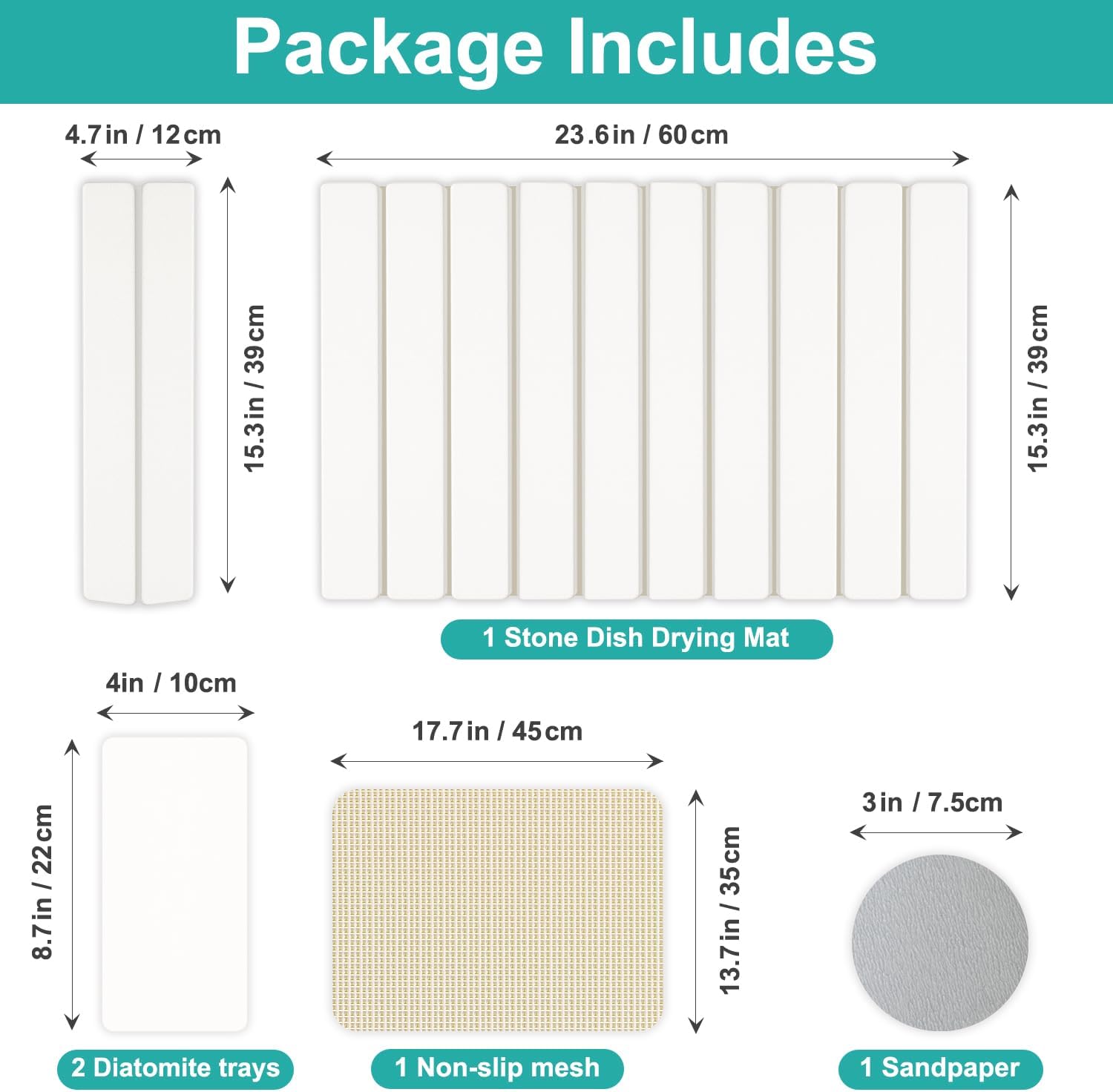 - 3 Pack Drying Stone Mats Set: You’ll receive one 23.6" x 15.3" large stone dish mat & 2 small stone drying trays, 1 sandpaper, and 1 non-slip pad.