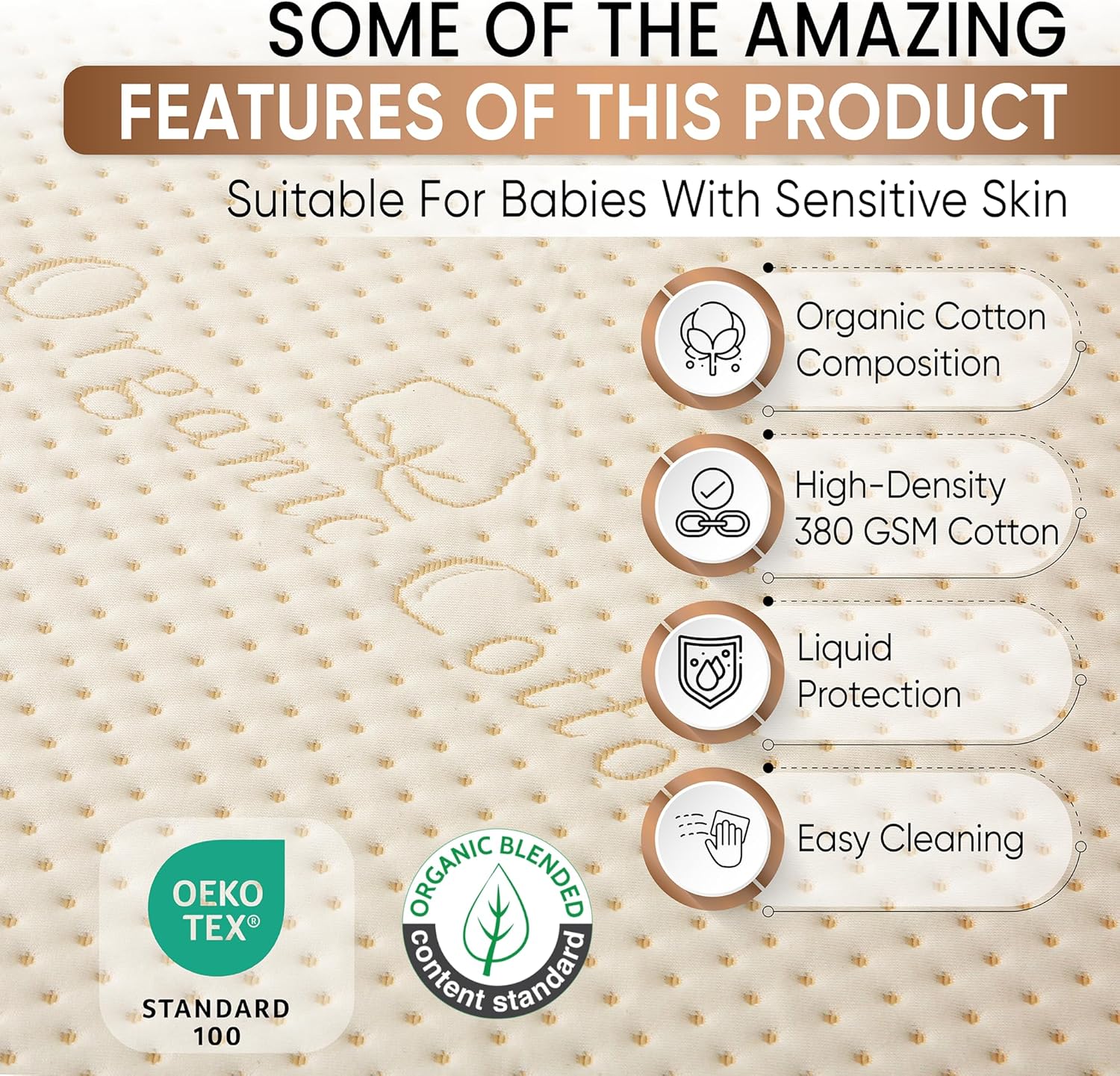 - CERTIFIED ORGANIC COTTON: Premium mattress protector made with a soft, heavyweight 380 GSM organic cotton top layer, certified by OEKO-TEX and OCS. Naturally breathable and gentle on delicate baby skin.