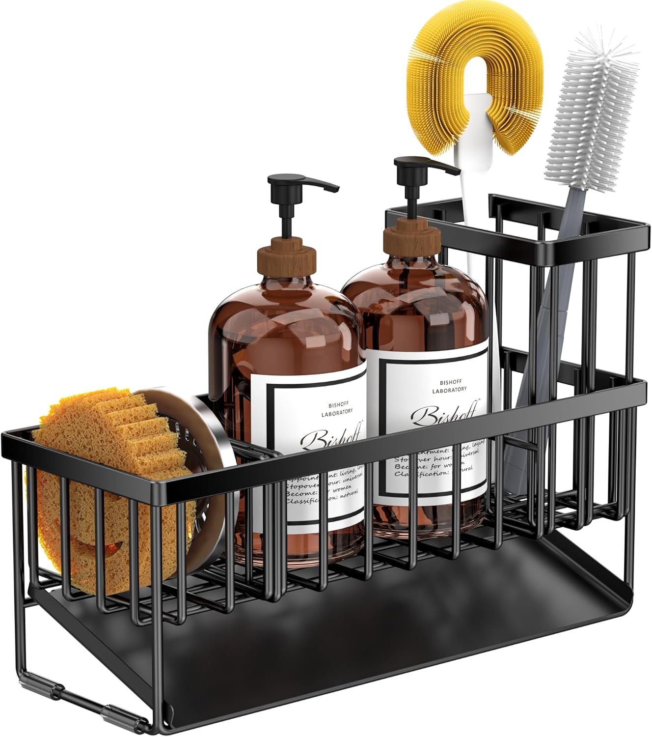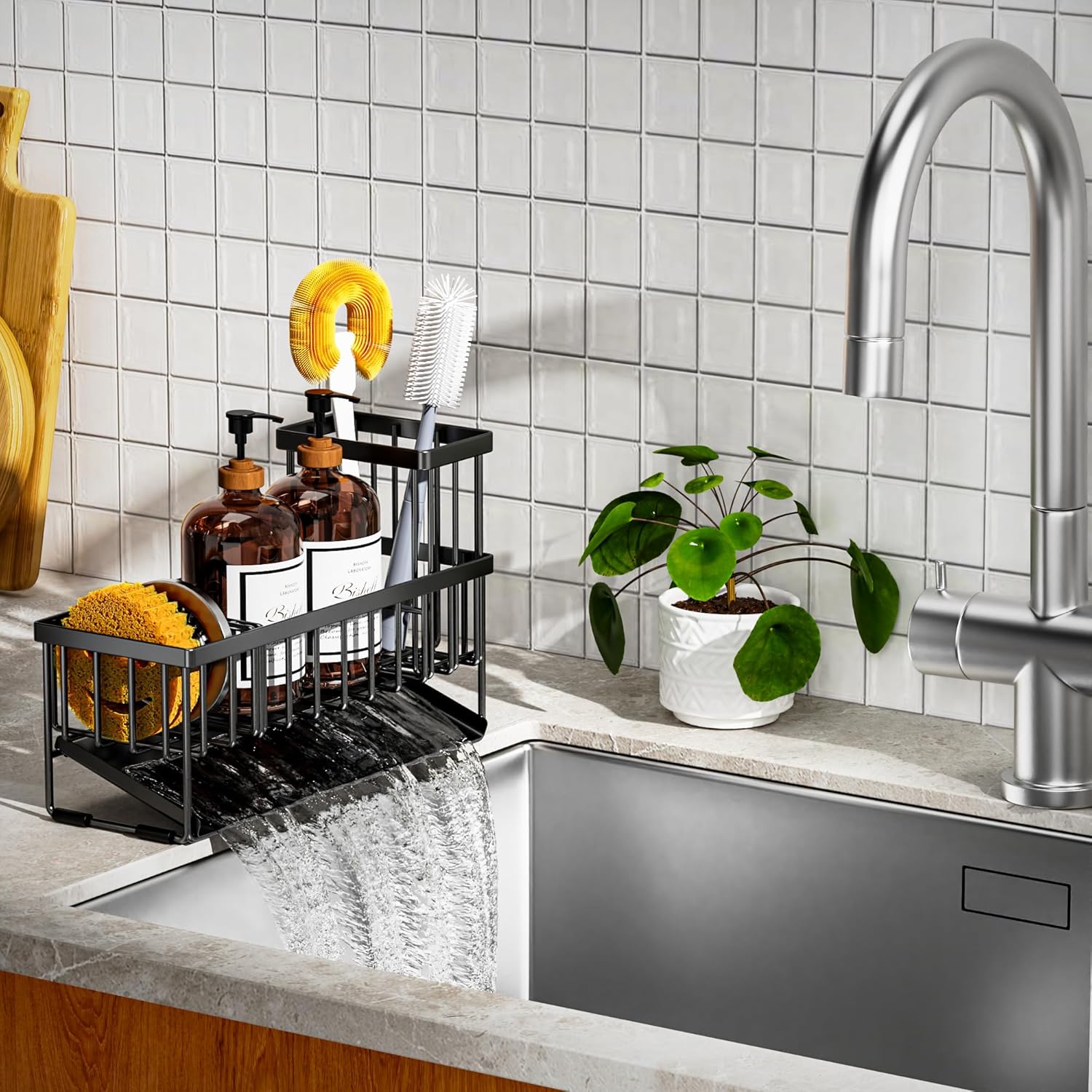 - ăREASONABLE DIVIDER DESIGNă The sponge holder for kitchen sink ergonomic divider design allows it to have 3 separate storage spaces, Different items are placed in different areas. Make the most of every inch of space and make your kitchen look cleaner.