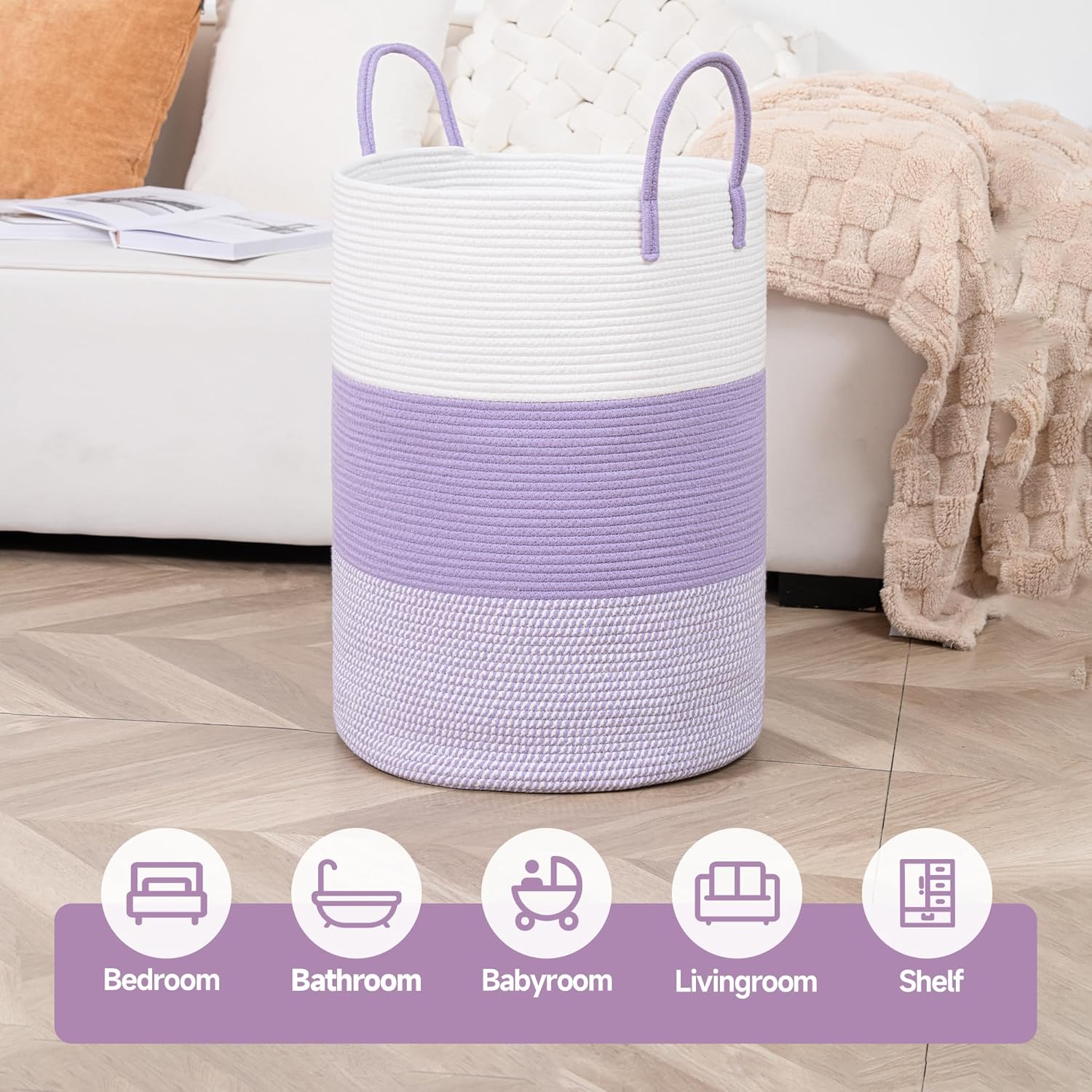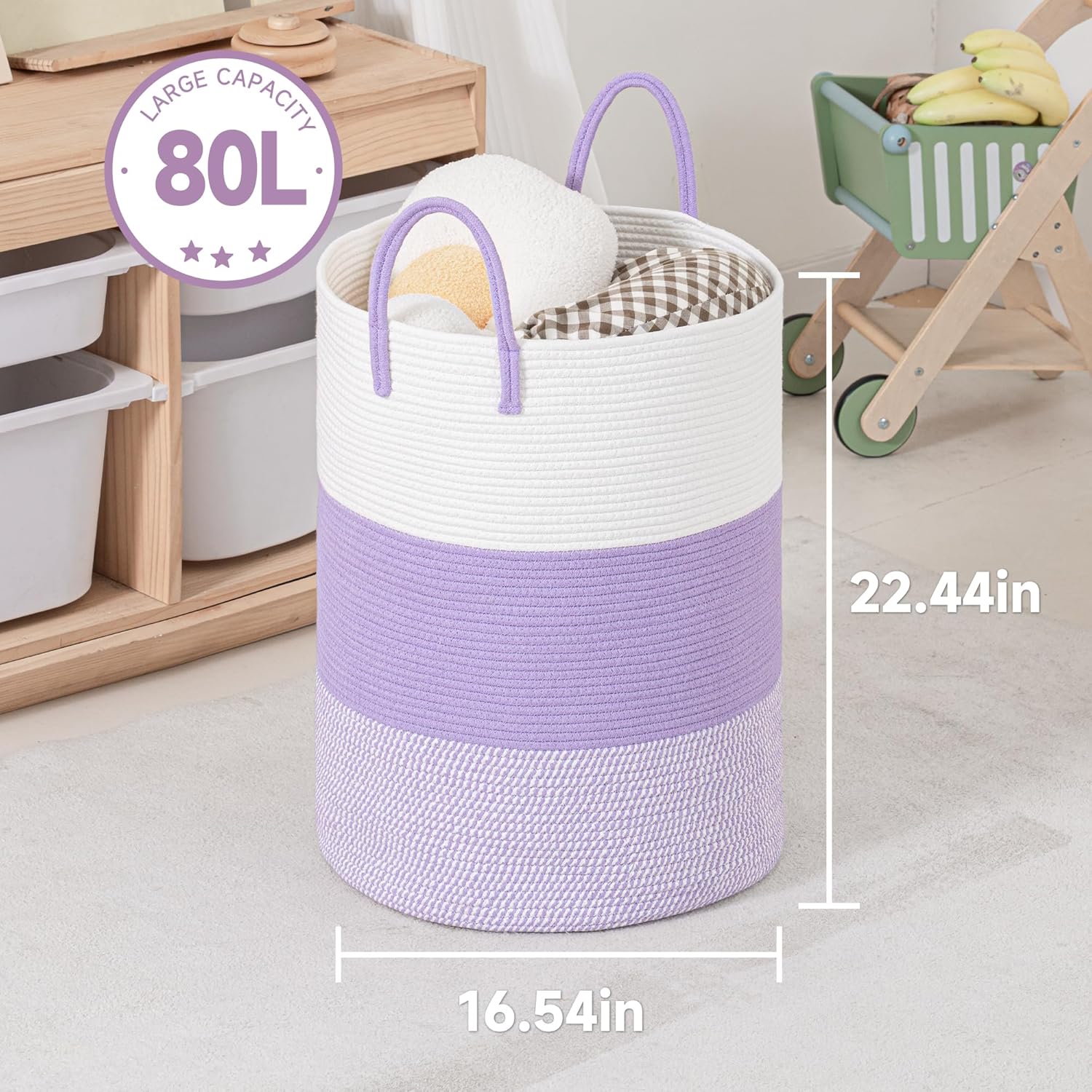 CLHMILY&Z 80L Laundry Basket Round Storage Rope Basket - 16.5x22.5 Inches - Lavender Hamper in Bedreoom and Cute Storage Bin for Blankets, Toys, and Nursery Essentials