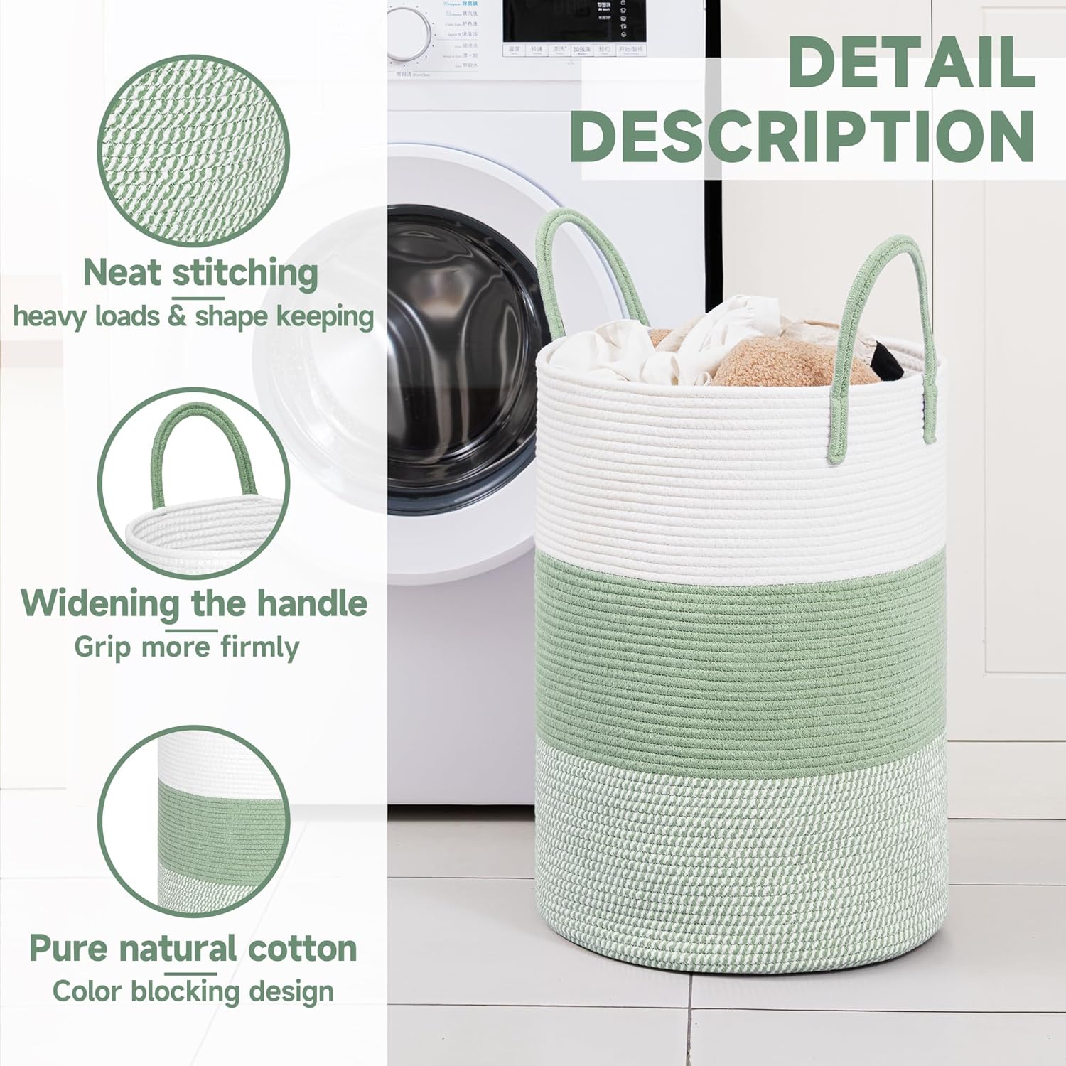 CLHMILY&Z 60L Laundry Basket Round Storage Rope Basket - 15x20.5 Inches - Green Hamper in Bedreoom and Cute Storage Bin for Blankets, Toys, and Nursery Essentials