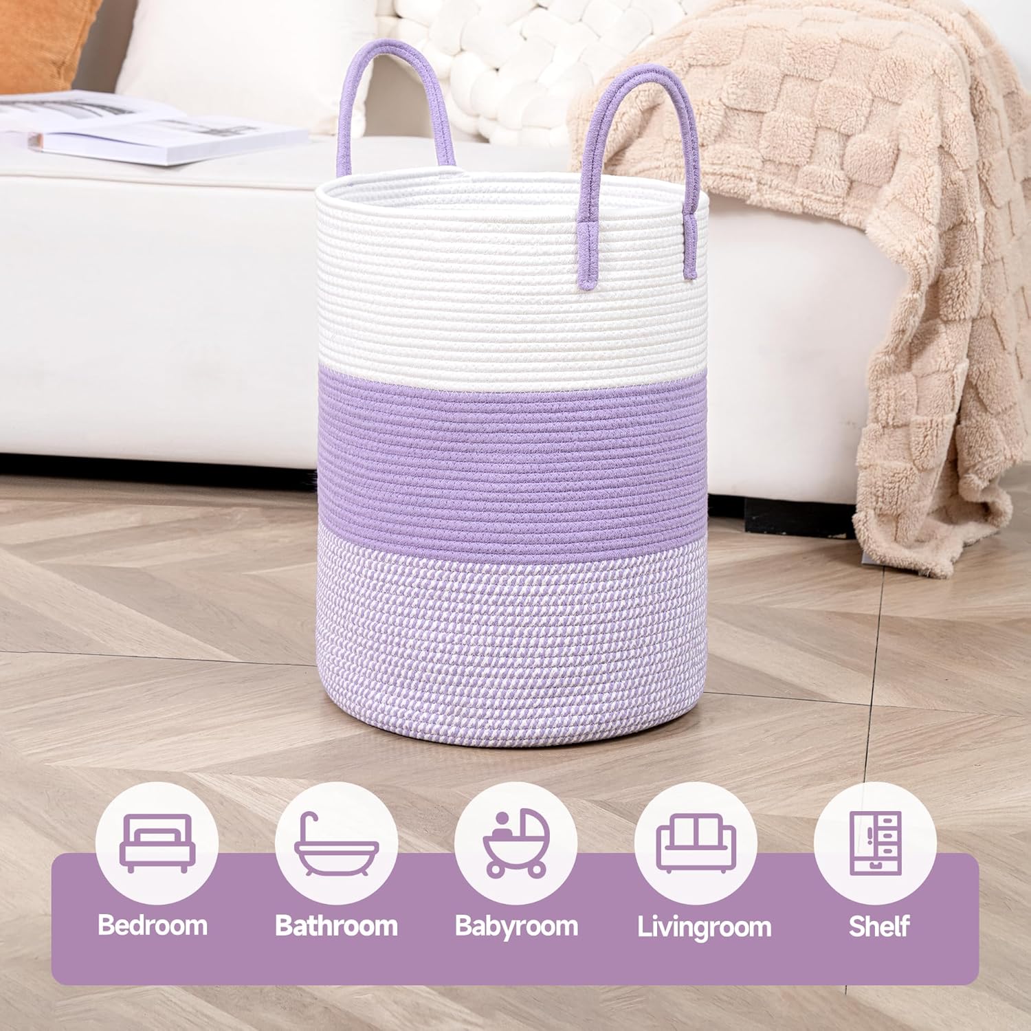 CLHMILY&Z 40L Laundry Basket Round Storage Rope Basket - 13x18 Inches - Lavender Hamper in Bedreoom and Cute Storage Bin for Blankets, Toys, and Nursery Essentials
