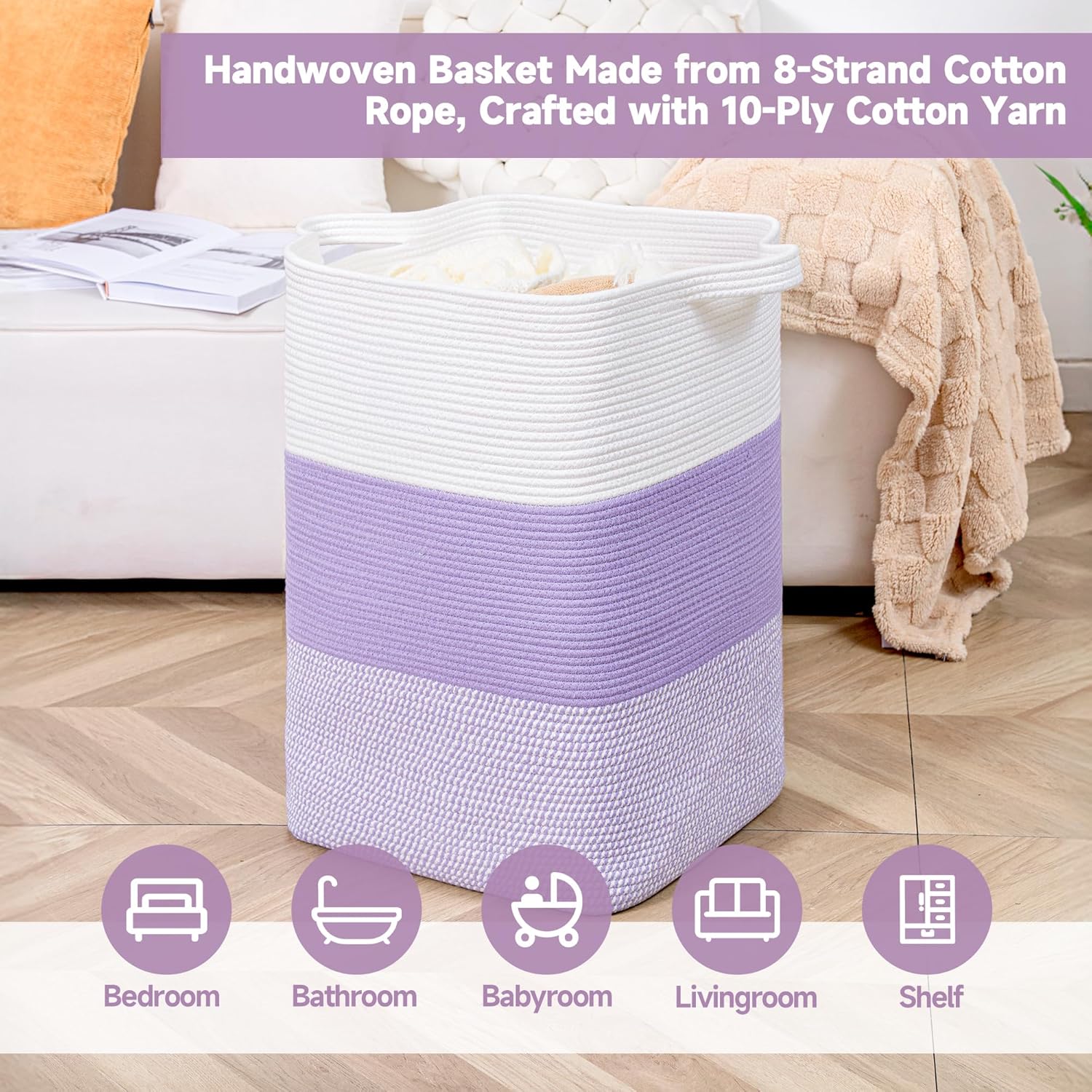 CLHMILY&Z 75L Laundry Basket Rectangular Lavender Rope - 16x13x22 Inches - Dirty Clothes and Soft Storage Bin for Blankets, Toys, and Nursery Essentials