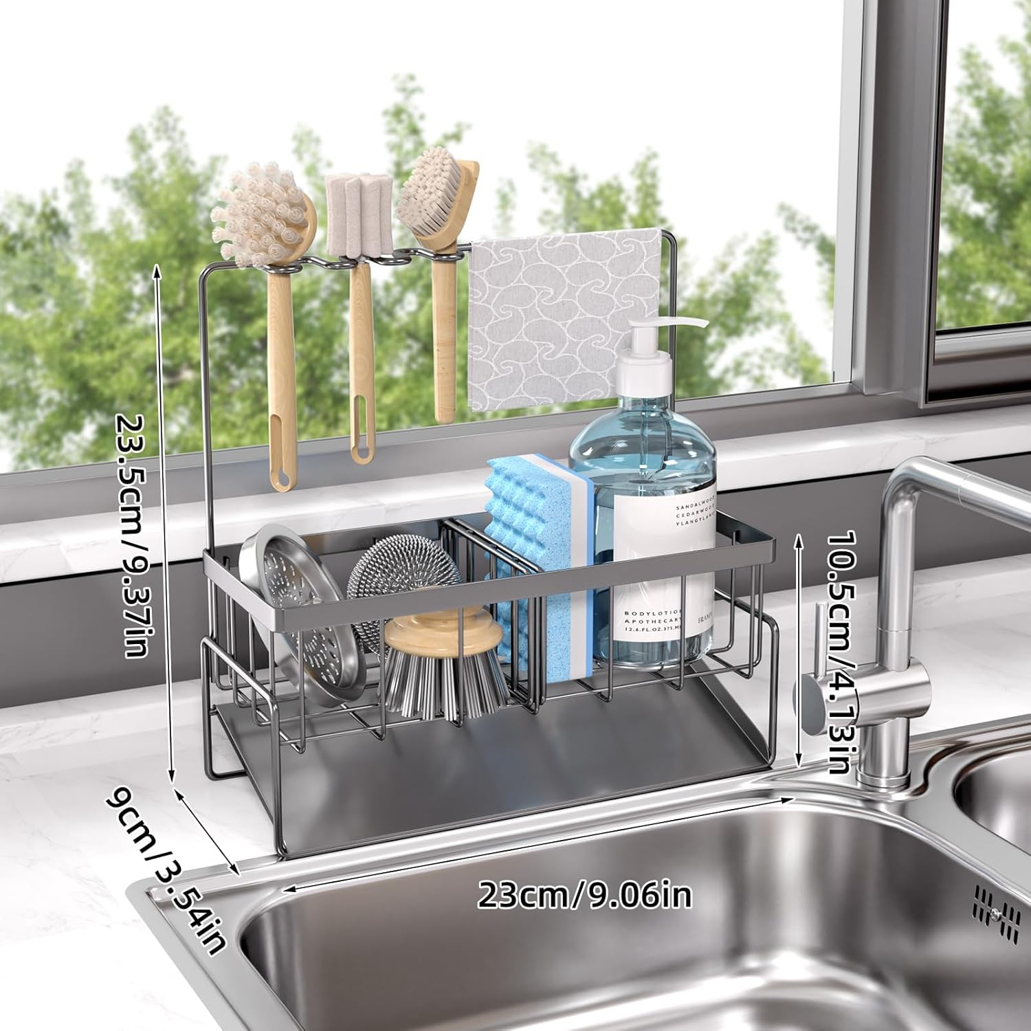 - ăLARGE CAPACITY&SAVE PLACEă NET MEYA sponge holder for kitchen sink is suitable for various kitchens.It measures9.37*3.54*9.06 inches,Holds detergent bottleăsponge ballăsink stopperădishcloth and so on.With an extra upgraded brush holder that can hold up to 4 small and large sized brushes,with this Sink caddy you can save countertop space perfectly.In addition,our kitchen caddy sink organizer has removable hanging discloth Holder for wet dishcloths that can dry your wet dishcloths quickly,its a multifunctional dish brush holder!