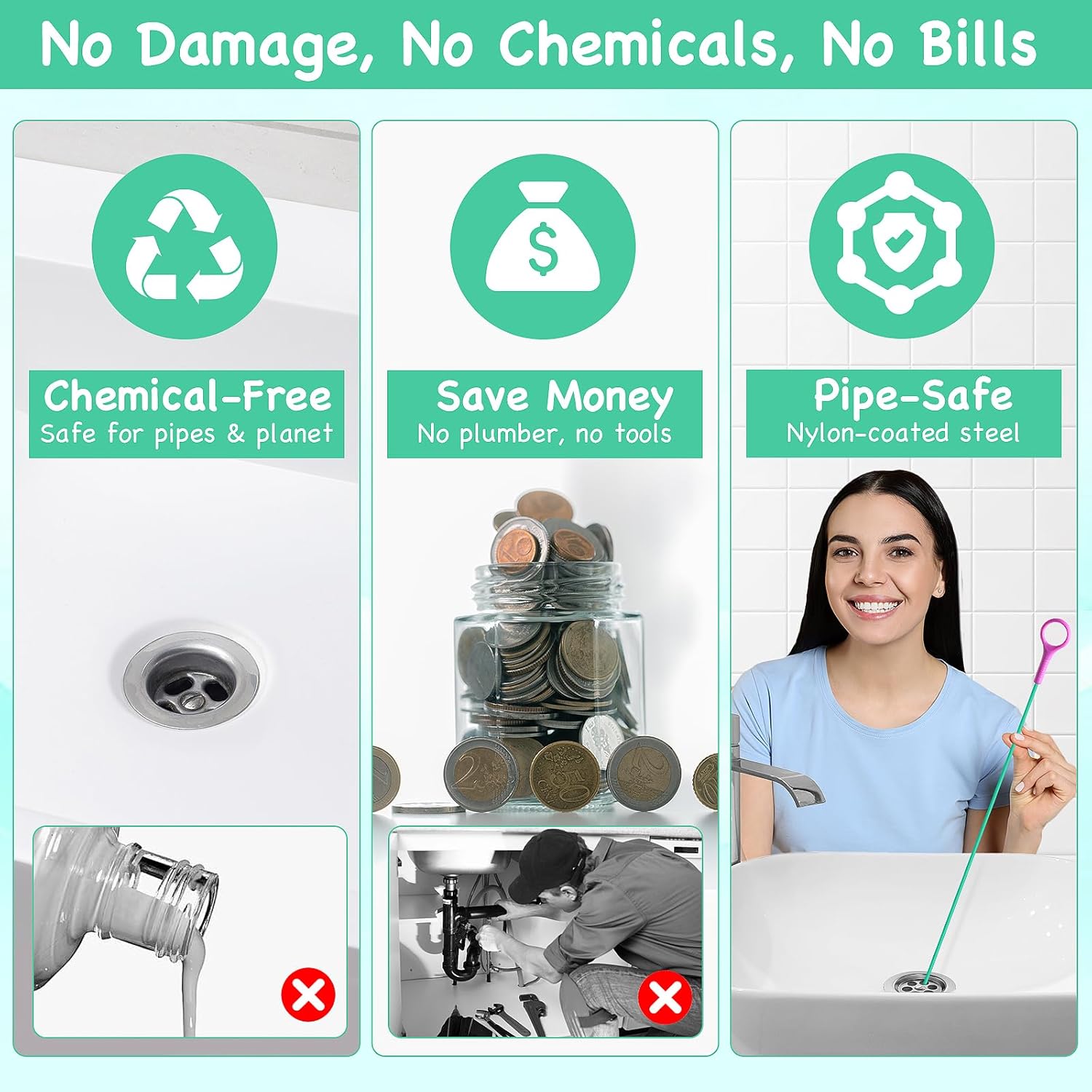 - Simple to Use, No Chemicals or Plumbers Needed:Slightly bend the tip, insert, spin, and pull—it’s that simple. This sink drain cleaner tool is intuitive for anyone to use at home, handling everything from a toilet snake drain clog remover to a shower drain snake with minimal effort, saving you time and money.