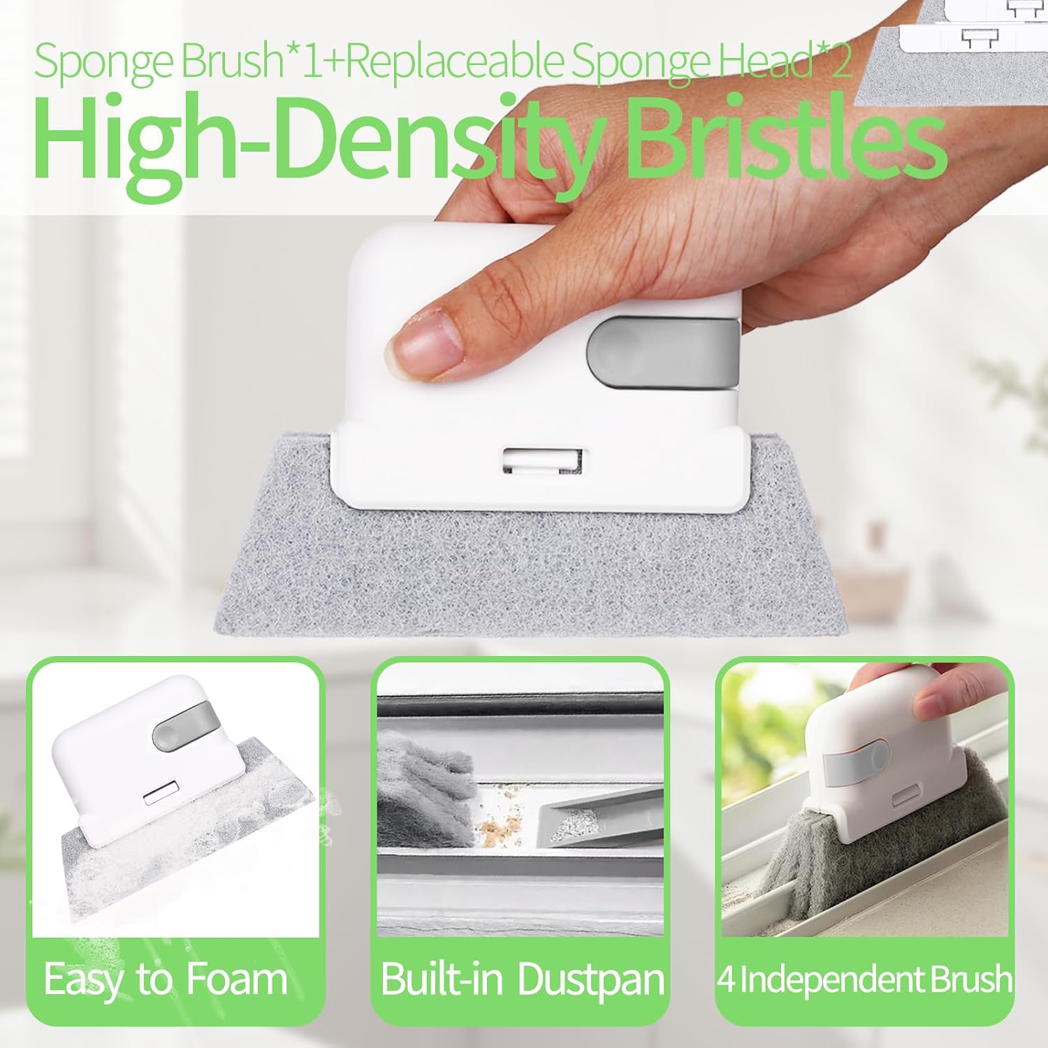 - 13-Piece Total Home Rescue Kit: Conquer Every Crevice, No Dust Left Behind! Includes 2 Crevice Brushes for tight spots, 3 Metal brushes for heavy-duty scrubbing, 2 Magic Sill cleaner tool (with 2 replaceable sponges), 2-in-1 Window/Door Track Cleaners, Swan-Neck Rail Brush, and a Shovel. Your ultimate weapon against neglected nooks in kitchens, offices, restaurant and beyond!
