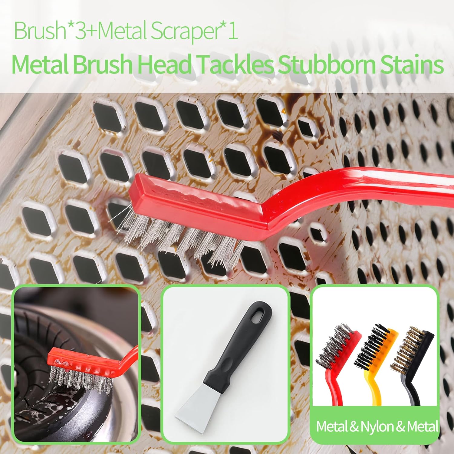- 4Tovetop Cleaning Brush Set: 3 different brushes with varying materials, offering different cleaning intensities , catering to various cleaning needs,The brass brush effectively tackles stubborn stains, gas stoves, and pot bottoms.