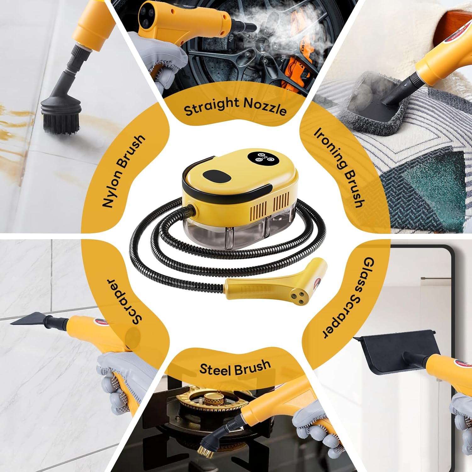 - Chemical-free Cleaning Steam: Most important advantage of the Handheld Steam Cleaner - Steam Cleaner only heated water to break down and remove stubborn dirt, dust, and grease, cleaning countless household surfaces without the use of chemicals. Steam Cleaner with a superpower of 1500 watts, Steam Cleaner generates a temperature of up to 221℉ (105℃) in just 10 seconds, without harmful smoke or residues, especially friendly to pets and children.