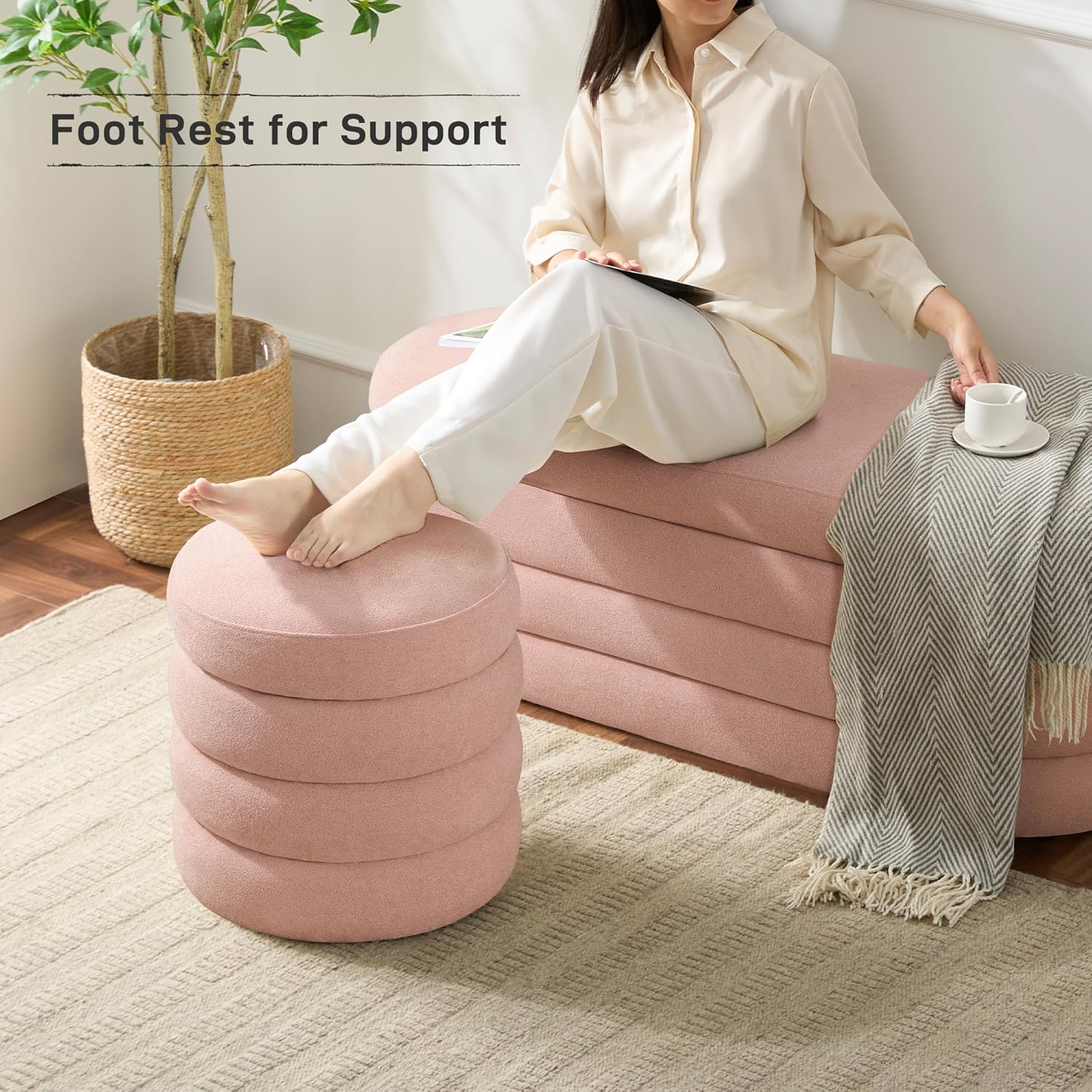 Round Ottoman with Storage Boucle Ottoman Stool Removable Lid for Living Room Modern Upholstered Vanity Storage Stool Foot Rest Bedroom Dorm Gifts Set of 2 (Pink)