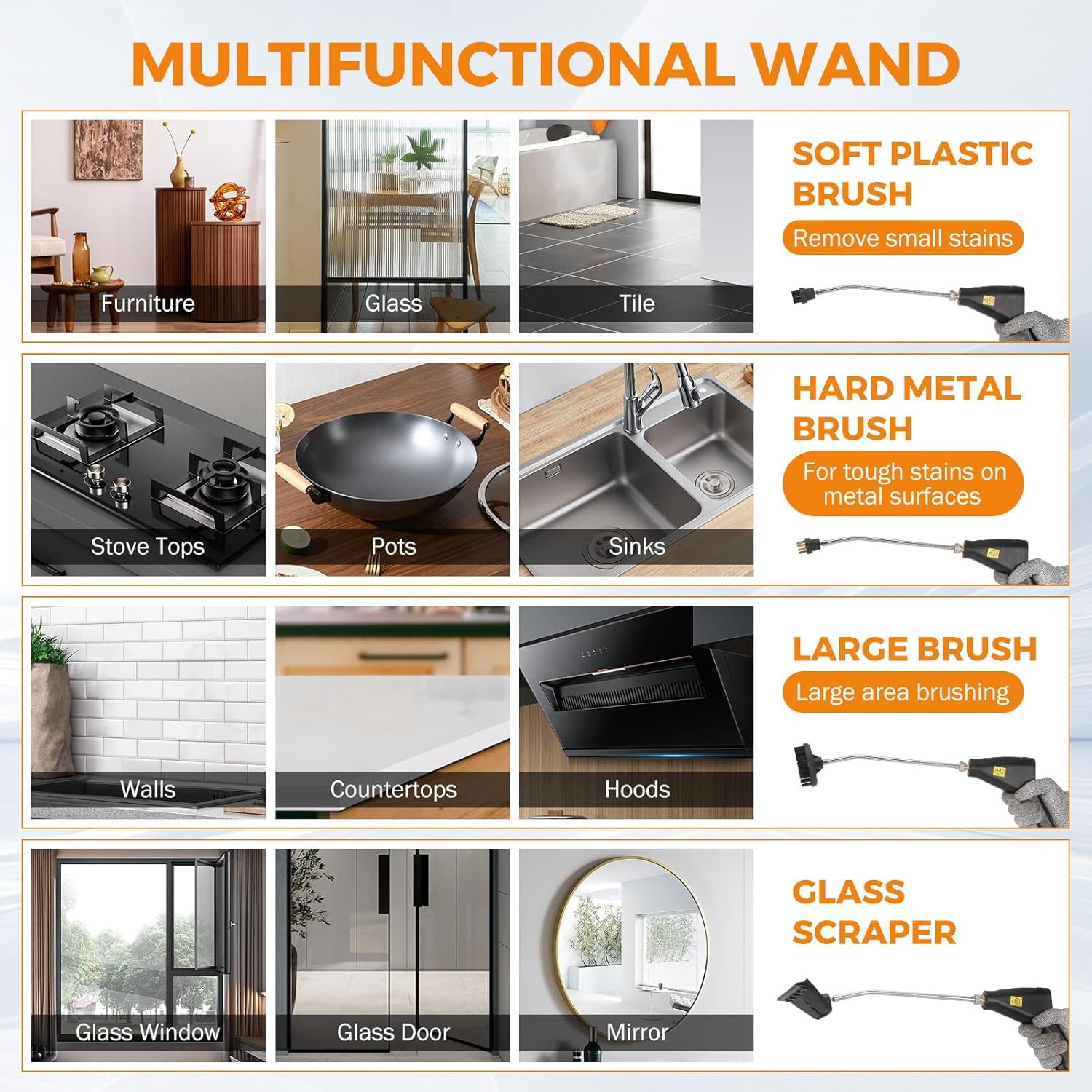 - **Portable & Flexible: Lightweight with a convenient handle for easy maneuverability. Extended power cord, water tube, and explosion-proof steam pipe provide a wide cleaning range.
