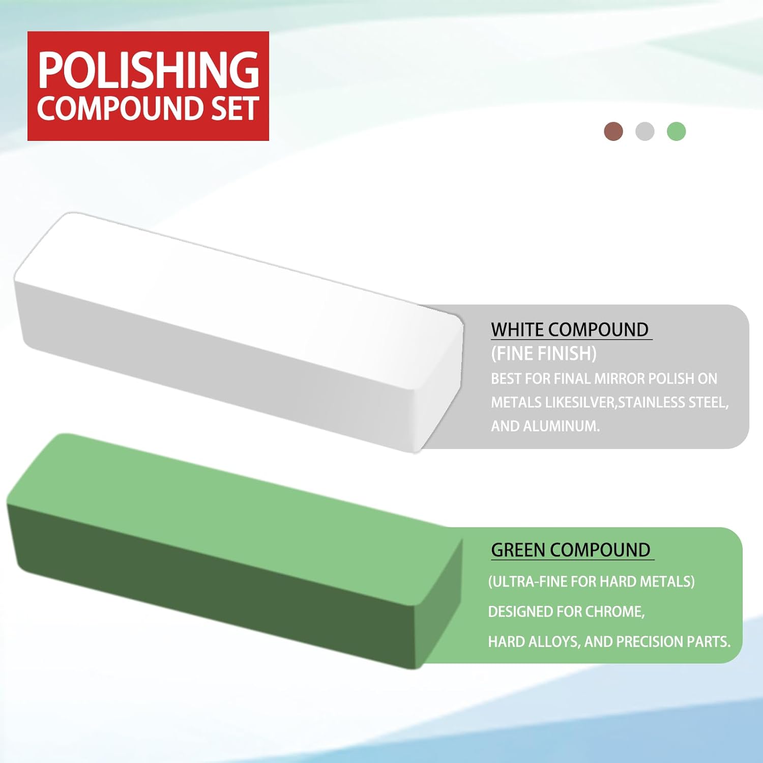 - 2 Piece Polishing Compound Set: Contains 1x white polishing compound (Fine Finish) and 1x Green Compound (Ultra-Fine for Hard Metals).