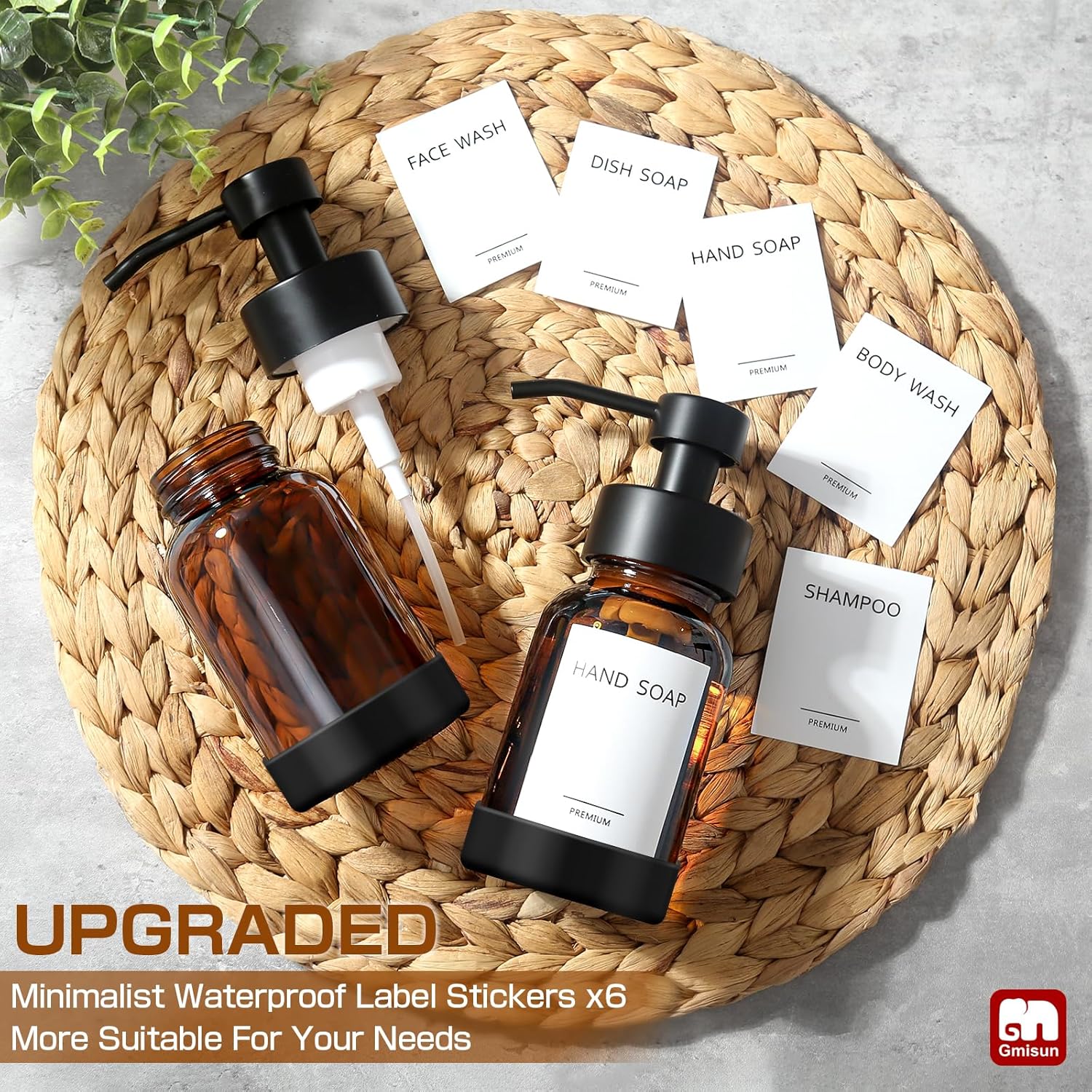 GMISUN Amber Foam Soap Dispenser, 8.5 Fl oz Amber Glass Foaming Hand Soap Dispenser for Bathroom & Kitchen, 2 Pcs Modern Refillable Foaming Soap Dispensers, Foam Pump Bottle with Label & Silicone Boot