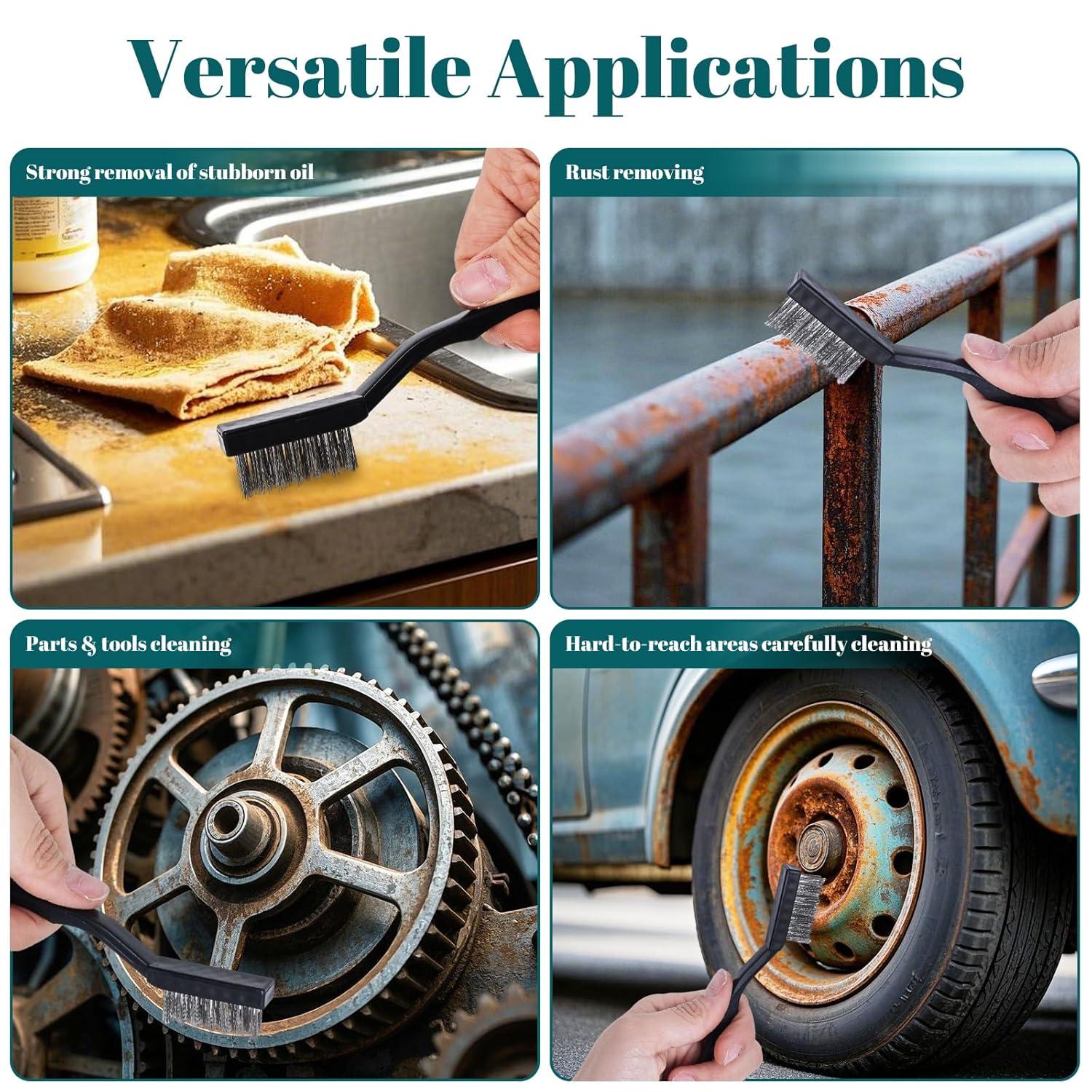 - 【Wide range of applications】: The stainless steel brush set is suitable for cleaning and descaling rust, steel parts, machinery, unfinished metal parts, paint stains, welding slag, special corrosion, and will not damage the surface, and can also be used to clean gaps such as door frames, sliding doors, floor tiles, etc