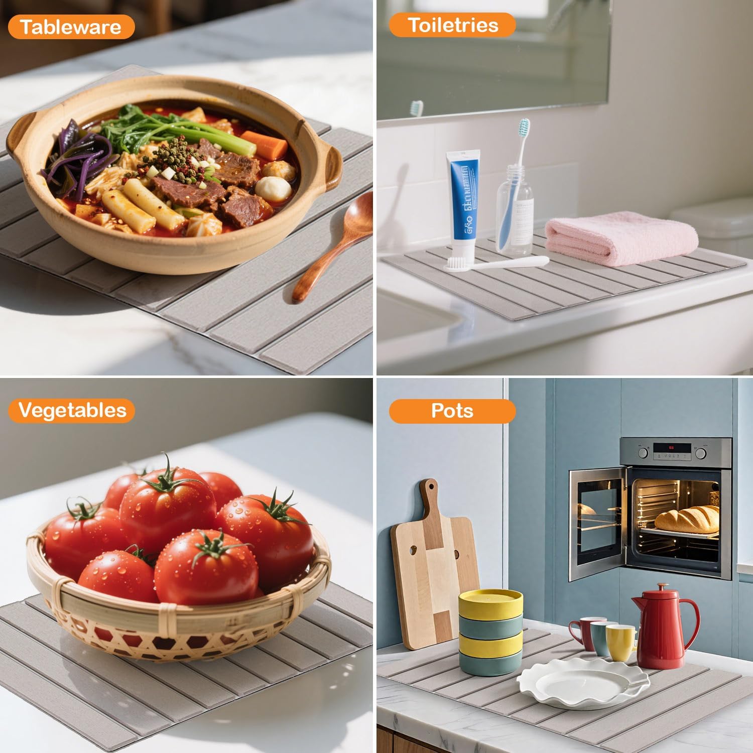 - Crafted with a textured stone-inspired surface, this mat quickly wicks away moisture from wet items, speeding up drying time. No more lingering puddles or soggy countertops—just a sleek, dry space ready for meal prep or entertaining.