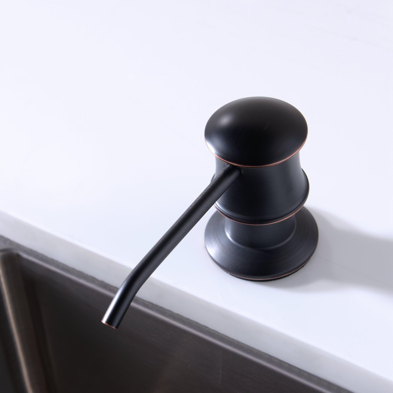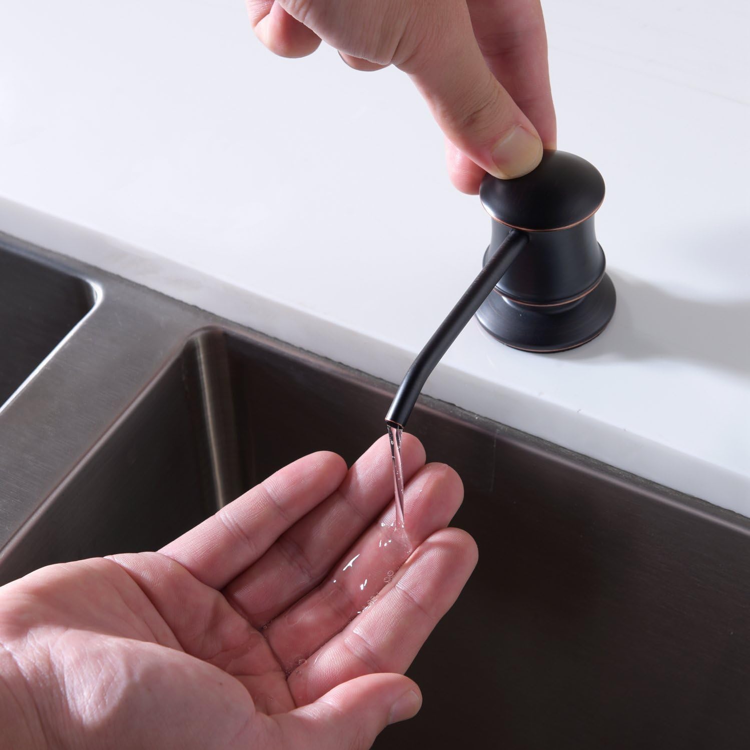 - The built-in design makes your kitchen countertop look clean and tidy,The classical shape paired with the oil-rubbed bronze color creates a high end aesthetic combination.Pls note:first pump takes about 50 presses, but thereโs a hose piece that keeps soap from sliding back into the container. So youโll never have to do that again.