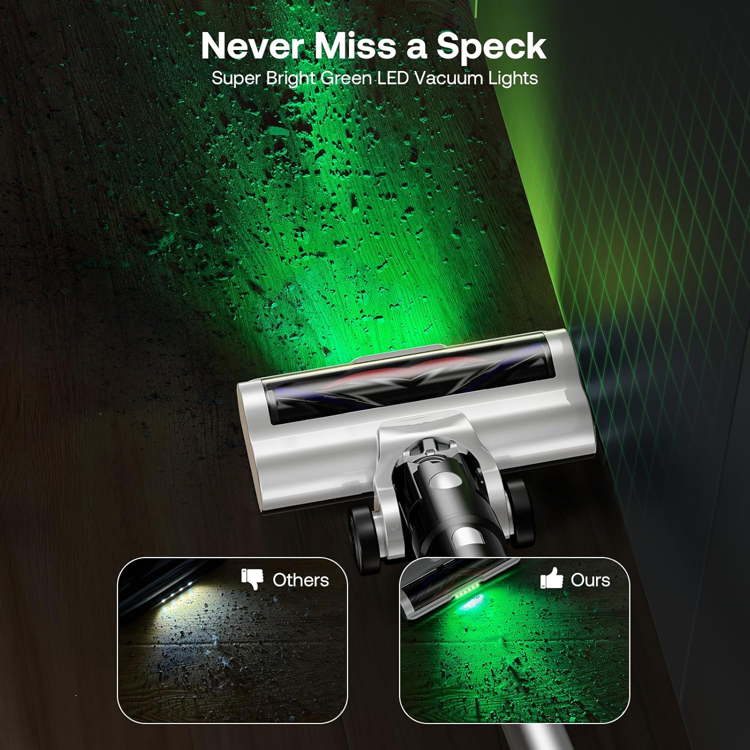 - [Green LED Headlight & Wide-Angle Floor Brush] Upgraded Green LED headlight projects a long-range beam to expose hidden debris under furniture. The green light offers superior dust visibility over white lights. Combined with wide swivel steering, Trucozie T550 vacuum cleaner for home easily cleans around obstacles and under low furniture. white lights. Combined with wide swivel steering, Trucozie T550 vacuum cleaner for home easily cleans around obstacles and under low furniture.
