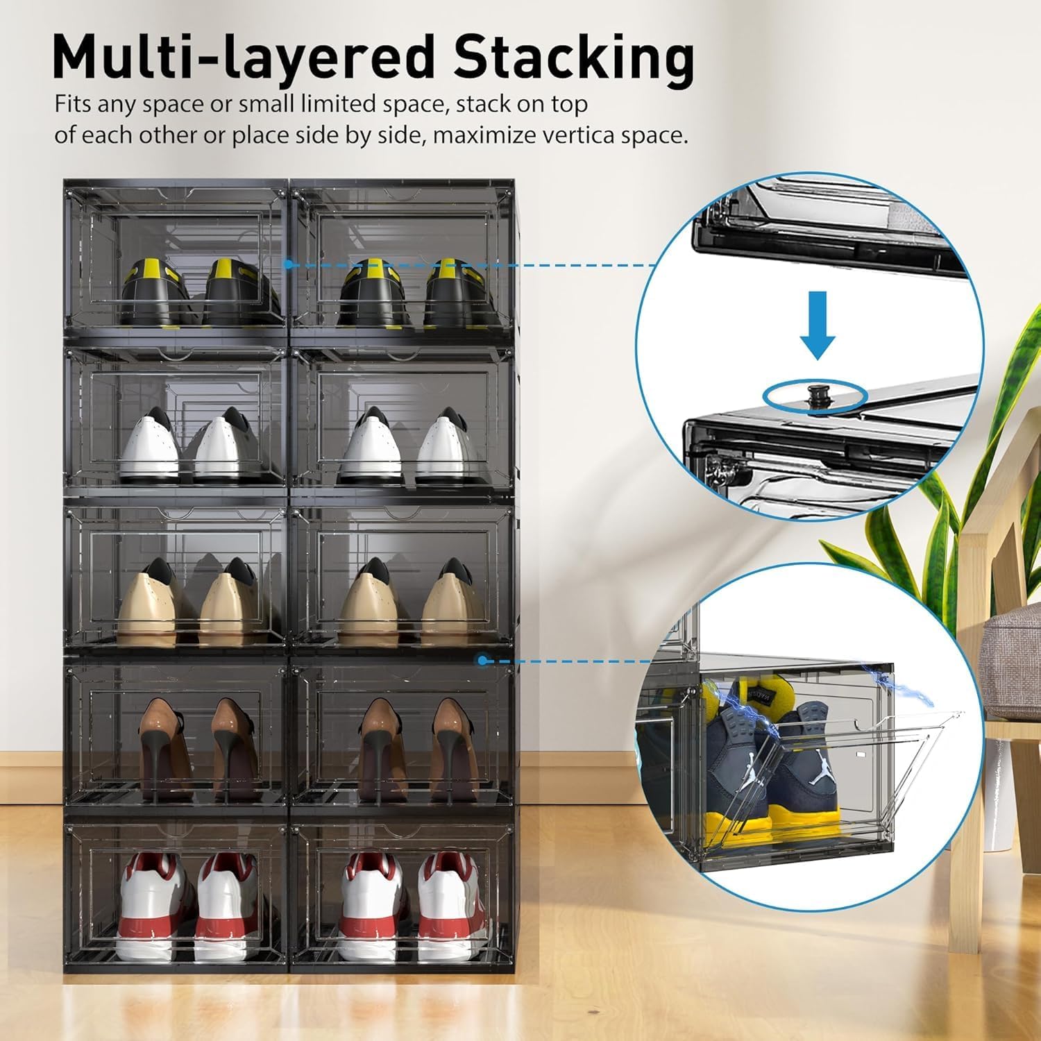 - High-Quality Hard Shoe Box:Our shoe organizer are made of sturdy hard plastic, with excellent durability and load-bearing capacity. The transparent acrylic magnetic door opens and closes smoothly. Elevate your shoe storage experience with our transparent, sturdy shoe boxes.