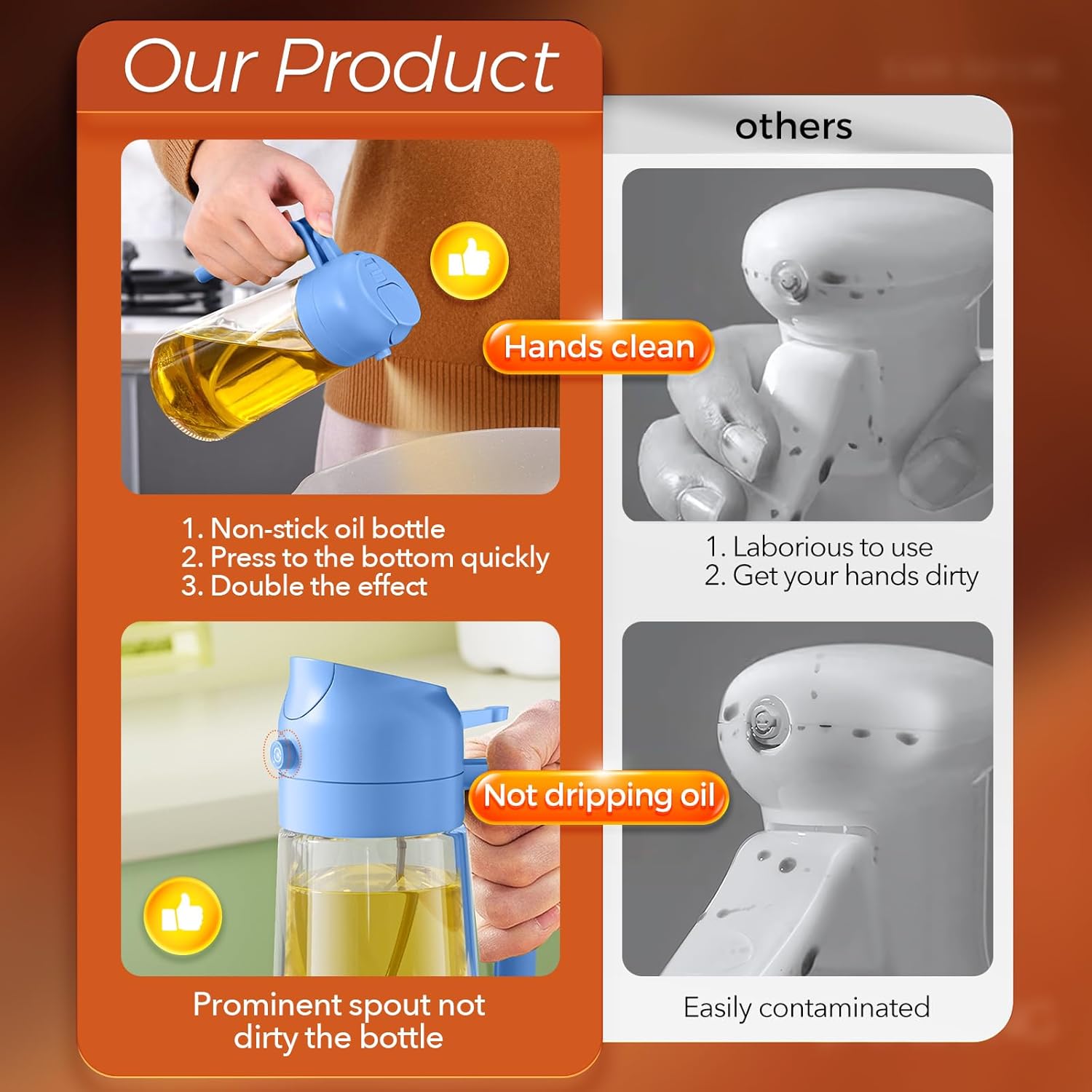 - Dual-Function Design & Multi-Purpose: Oil spray bottle for cooking offers the convenience of both spraying and pouring oil, suitable for a wide range of food preparation processes such as salad dressing, griddle, roasting, grilling