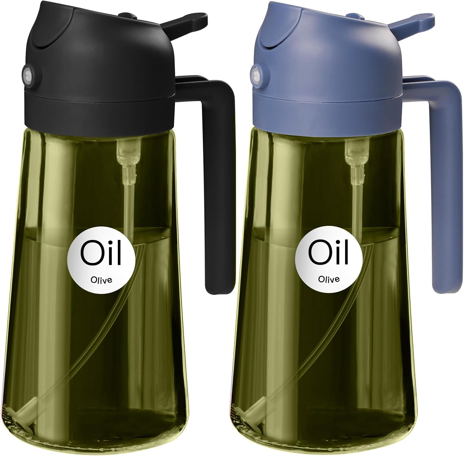 YARRAMATE 2Pcs 16oz/470ml Dark Green Oil Sprayer for Cooking with Stickers, Food-grade Premium 2 in 1 Olive Oil Dispenser Bottle for Kitchen Gadgets, Air Fryer, Salad, Frying, BBQ (Black&Navy)