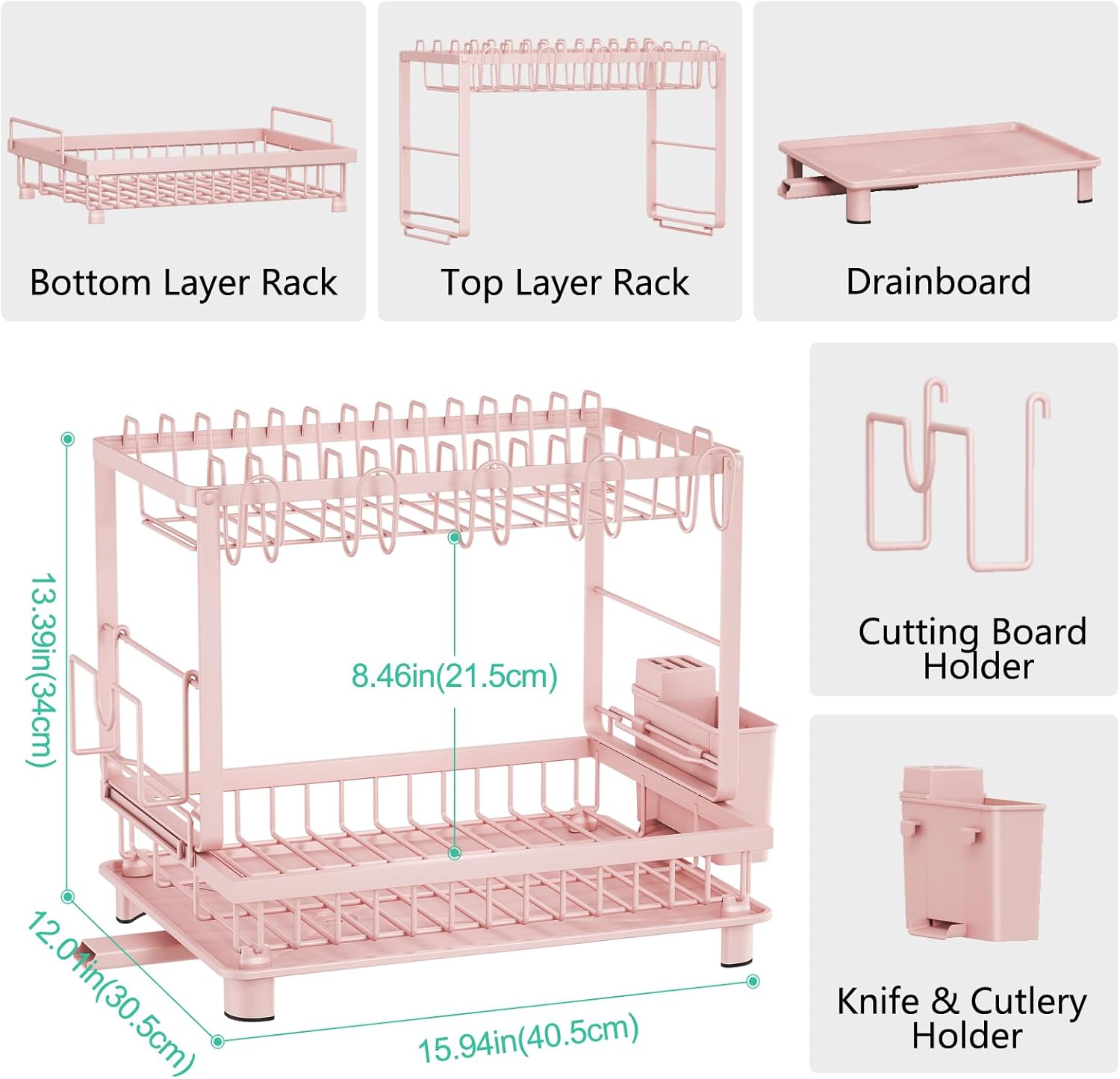 Multifunctional Dish Drying Rack - Rustproof, 2-Tier Dish Racks with Drainboard, Space-Saving Design, Utensil & Cup Holder for Kitchen Counter, Pink