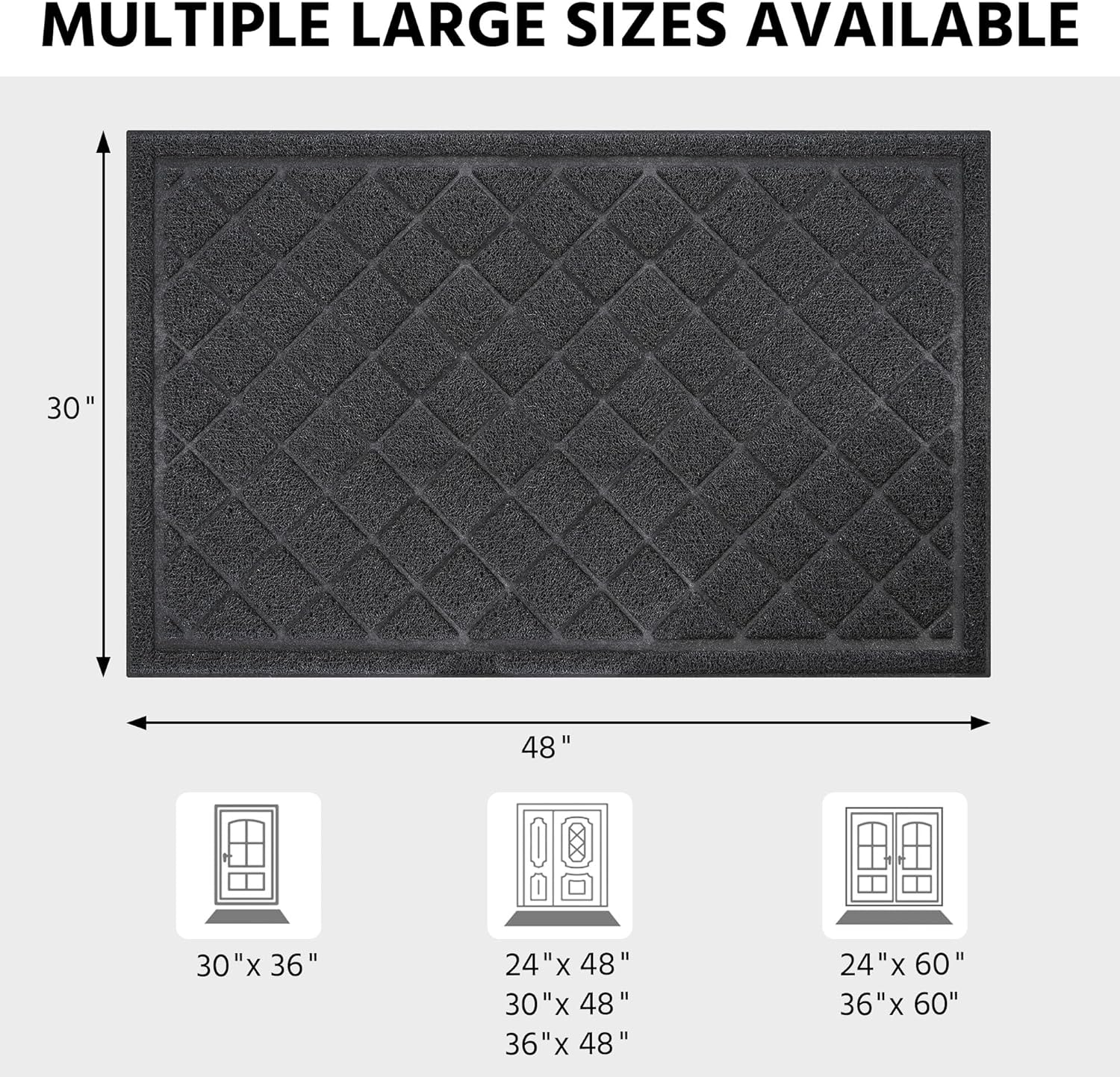 - 【Multi Size】: 24" x 48" , 24" x 60" , 30" x 36" , 30" x 48" , 36" x 48" , 36" x 60" , 36" x 72" , 48" x 72" , 0.4 inch thick , low profile design so doors won't get stuck. Heavy duty extra large door mat entrance rug carpet widely used for outdoor indoor, exterior patio entry way, garage, garden, shopmall with high traffic inside and outside.