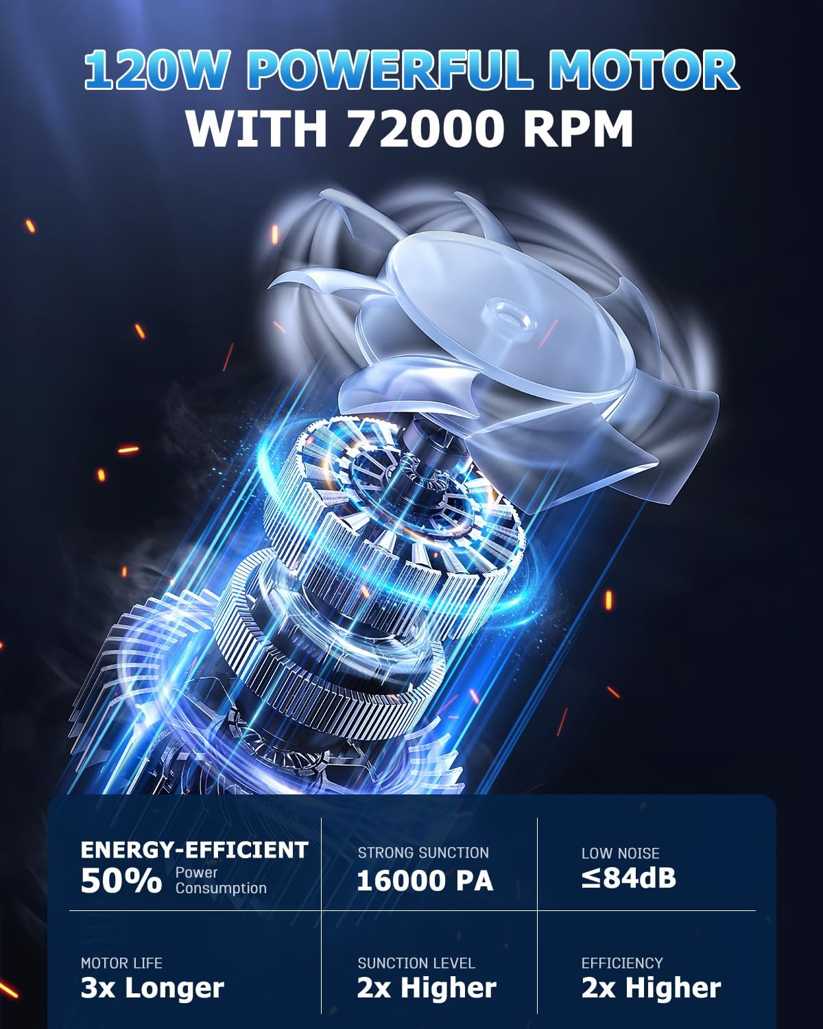 - đă16KPA POWERFUL SUCTIONăThe dust busters cordless rechargeable is equipped with a 120W high-powered motor that spins at up to 72,000RPM and provides 16,000PA powerful suction. Whether it's dust and debris on the floor or hidden dirt in narrow crevices can be quickly cleaned. Easily cope with the cleaning of home, car interior, office desktop, efficiently clean every corner, saving you precious time and energy