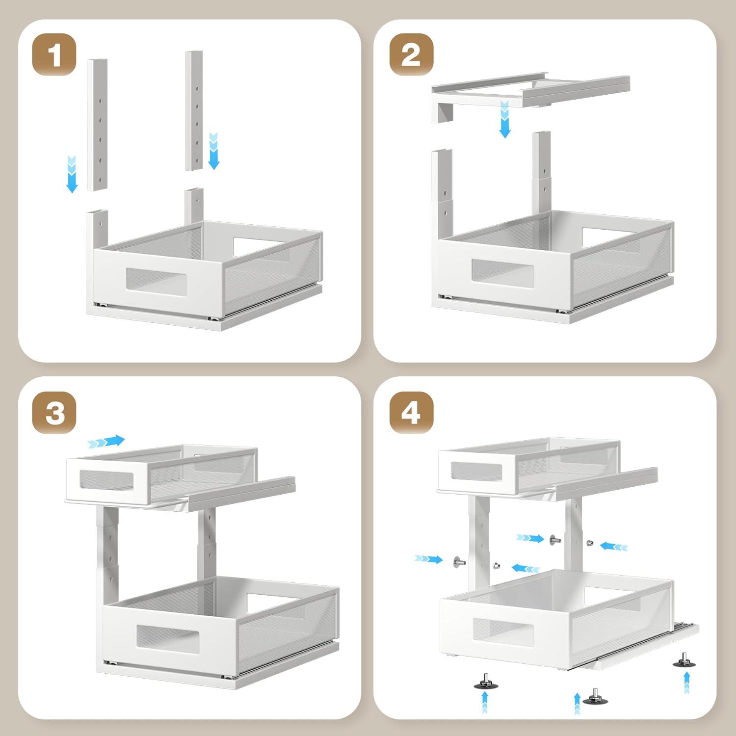 - 【Easy Installation】Say goodbye to complicated assembly! With 90% of the components pre-assembled, simply tighten 2 screws and your spacious undersink organizers is ready in just 40 seconds.