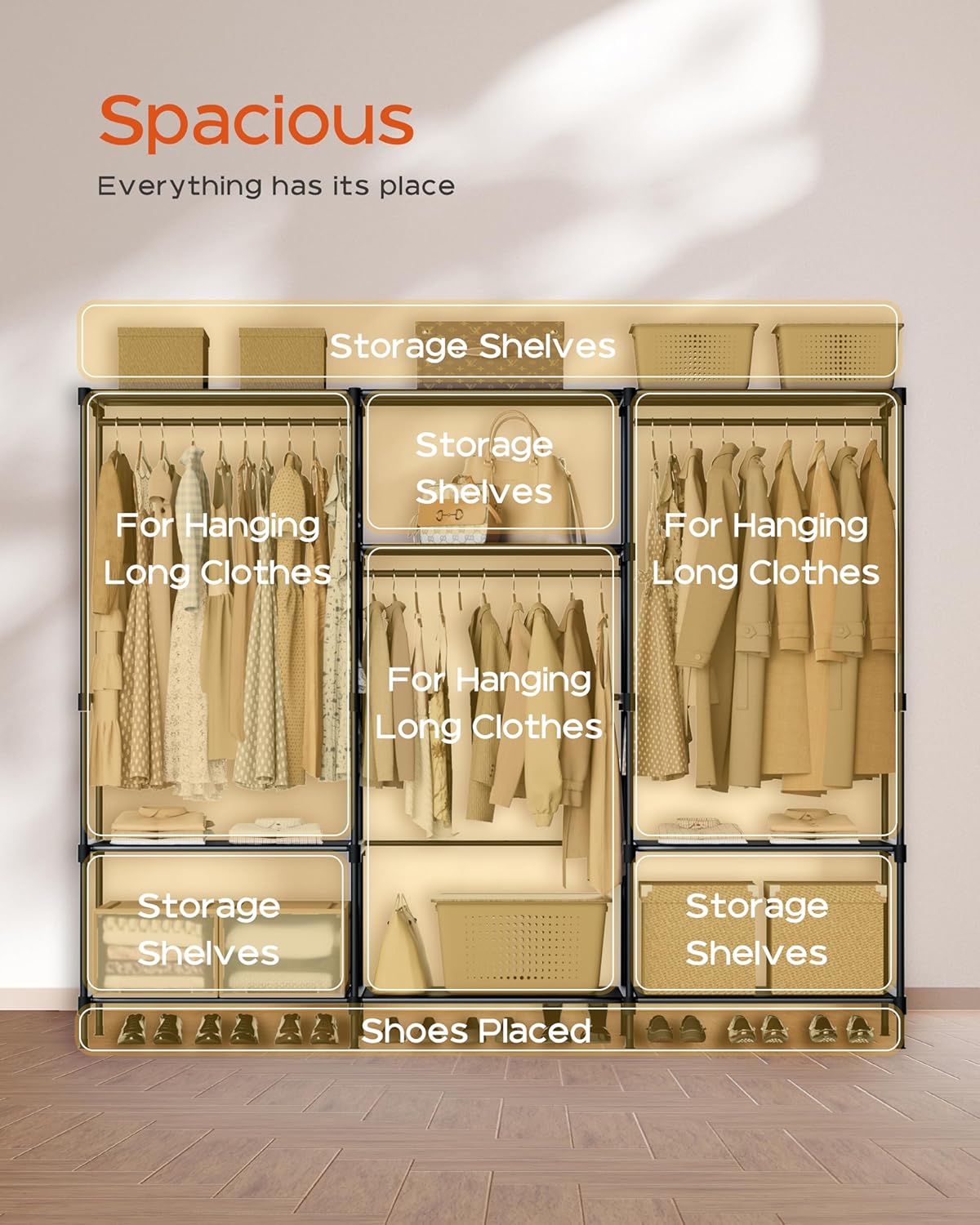 - [Versatile Storage Areas] This closet has 3 areas for hanging long clothes, as well as multiple shelves for folded clothes. The top area of the wardrobe can holds storage boxes, bags and other items, and the space under the bottom shelf for shoes; maximize your storage needs.