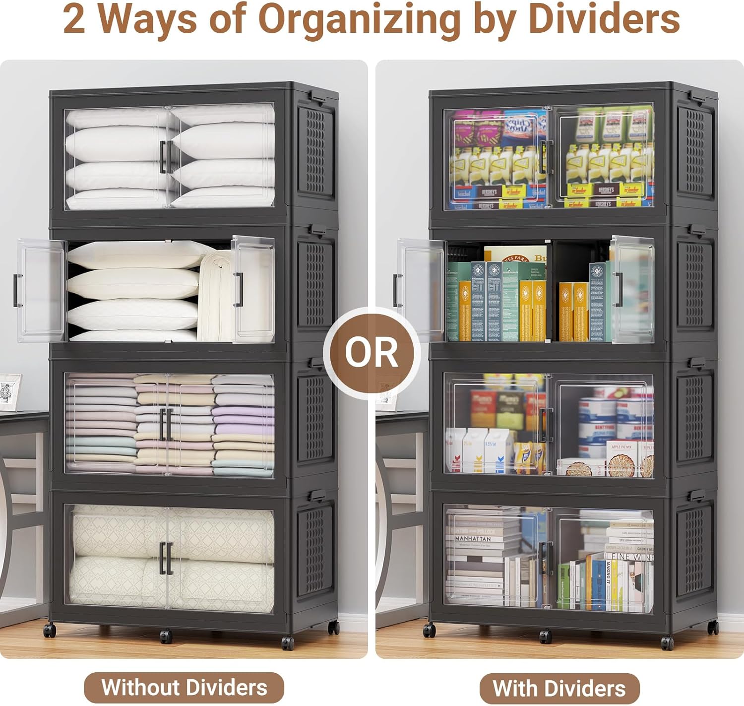 - 【Foldable, Stackable, Easy Assembly 】V40 storage bins can be collapsible, When not in use, they can be folded up to save space;It also can be stacked layer by layer into a cabinet, with side buckles to secure each level, preventing tipping or scattering. Each extra large storage bins set has removable 6pcs 360° rotating wheels, allowing easy movement—an essential large storage bin for homes. You can quickly unfold or collapse in just 5 minutes. (Note: need to insert door/handles by yourself)