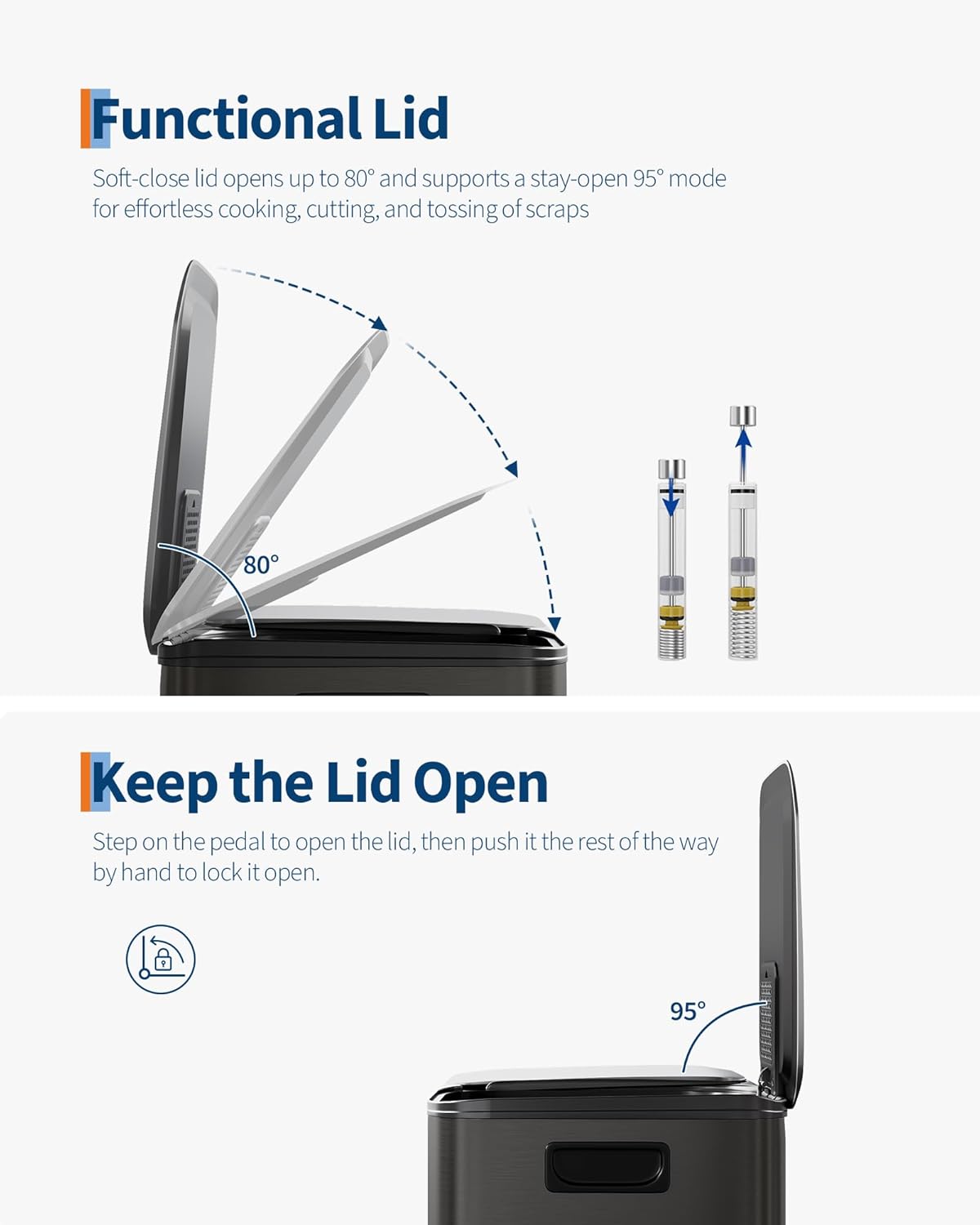 - [PRACTICAL DESIGN] β GarveeHome's dual trash and recycling bins put ease of use first. Ergonomic side handles let you lift and relocate the entire unit effortlessly. The soft-close lid opens to 80Β° without collision with standard kitchen island edges, and locks at 95Β° for hands-free cooking prep and scrap disposal. Dual inner buckets with weighted-edge lids trap odors separately. A custom liner ring secures any standard bag snugly, eliminating slips, bunching, and overhang
