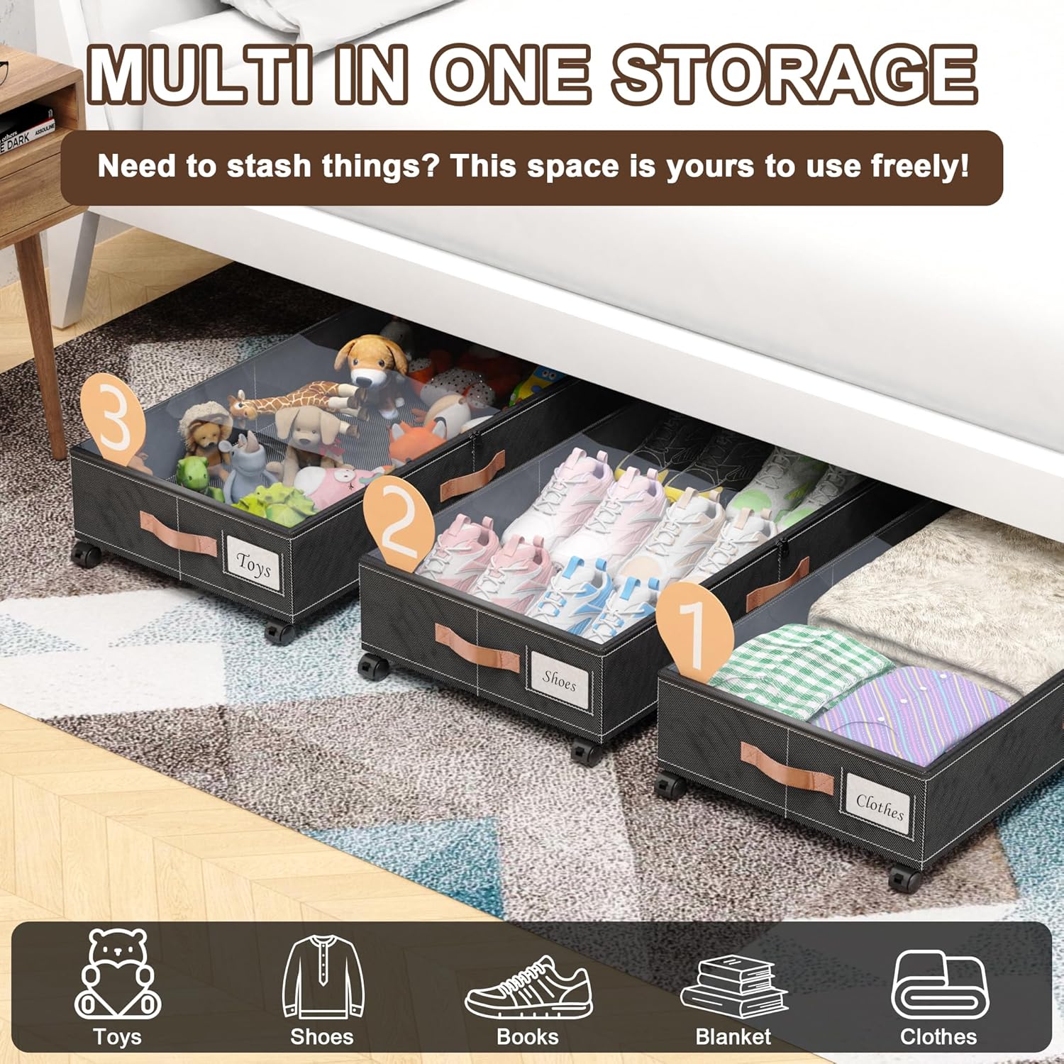 - 【360° Rotating Slide Wheels】Mobile storage no stress. Under Bed Storage Containers is equipped with 3 X side handle and 4 x 360°rotating wheels, that glide effortlessly on various surfaces. There is no sound when sliding, Beborxue Underbed storage baskets are ideal for bedrooms, living rooms, dorms, shoe cabinets, attics, basements and other places to use.