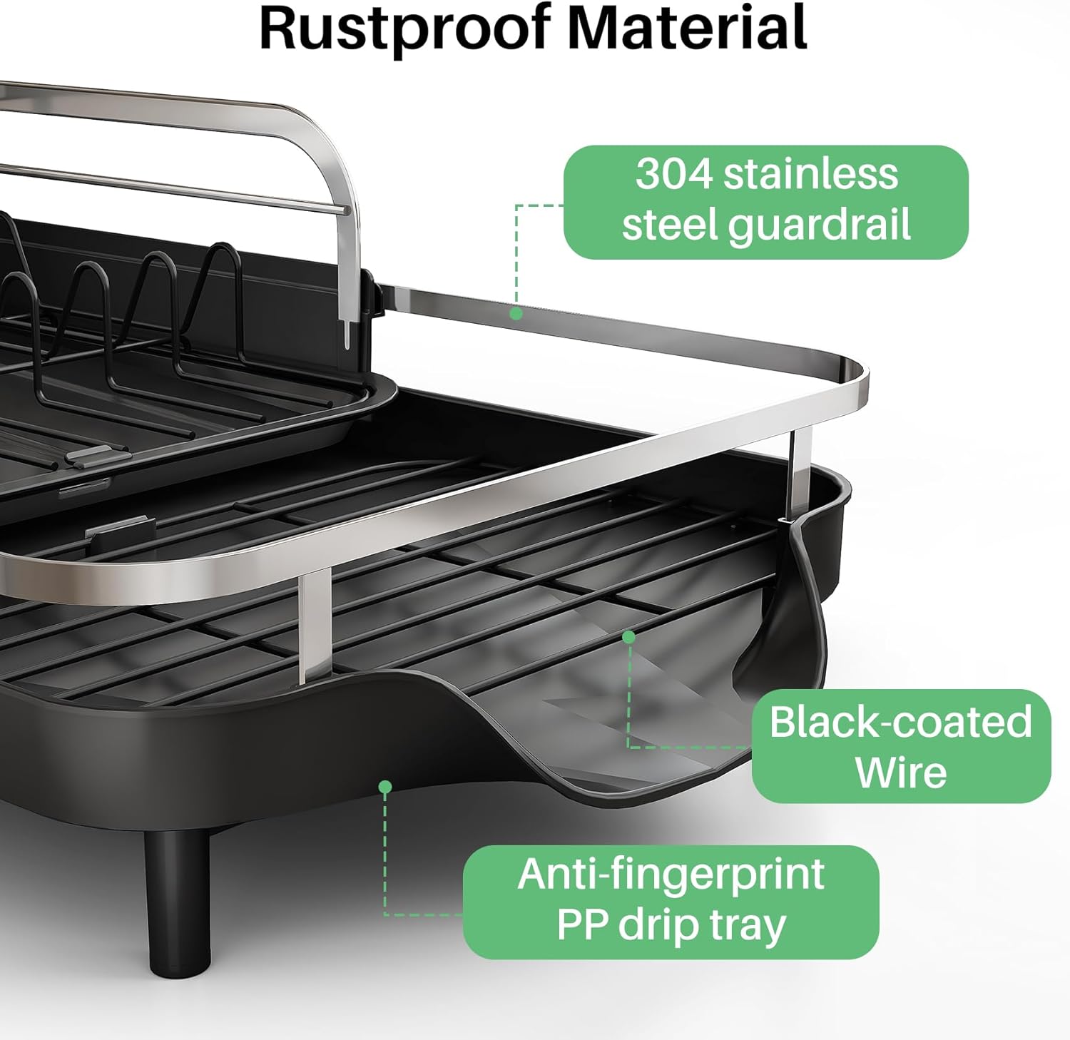 - Anti-Rust Material: Made from premium stainless steel guardrails, black-coated metal wire, and anti-fingerprint PP drip trays, this dish rack is built to resist rust and deformation. Non-slip silicone caps keep it securely in place and prevent scratches on your countertop
