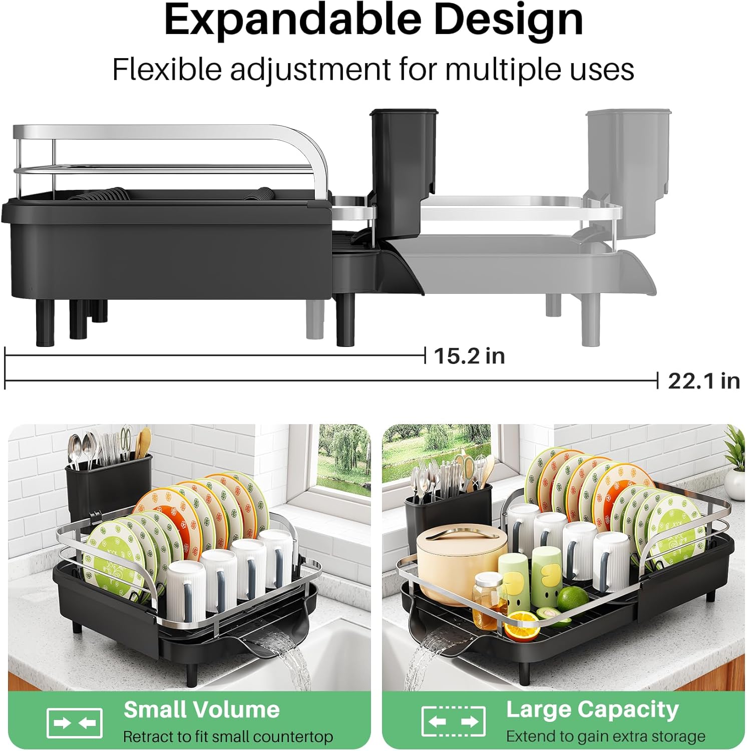 - Flexible Fit for Kitchen Counter: Whether you're working with limited space or handling extra dishes after a meal, this extendable dish rack easily adjusts from 15.3" to 22.2" to meet your needs—keeping your kitchen gadgets organized and within reach