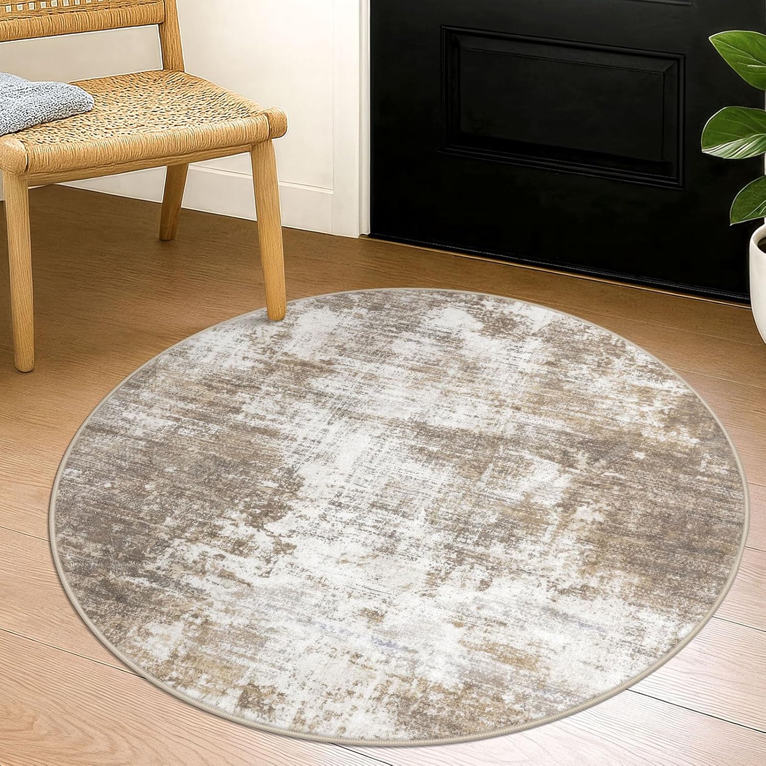 IOHOUZE Round Area Rug 3 Ft Circle Entryway Rugs Round Washable Door Mat Indoor Entrance, Non Slip Circle Front Door Rug, Printed Abstract Faux Wool Floor Carpet for Foyer Porch Sink, Beige Brown