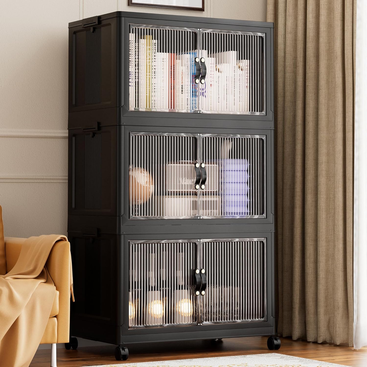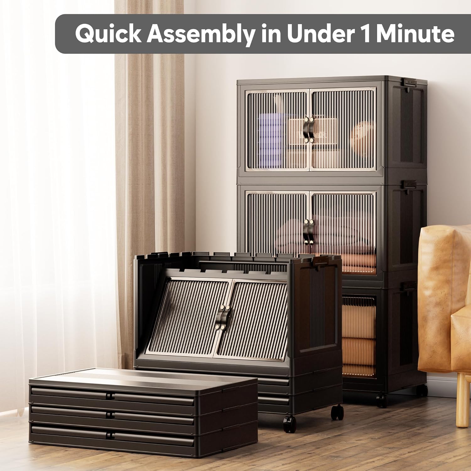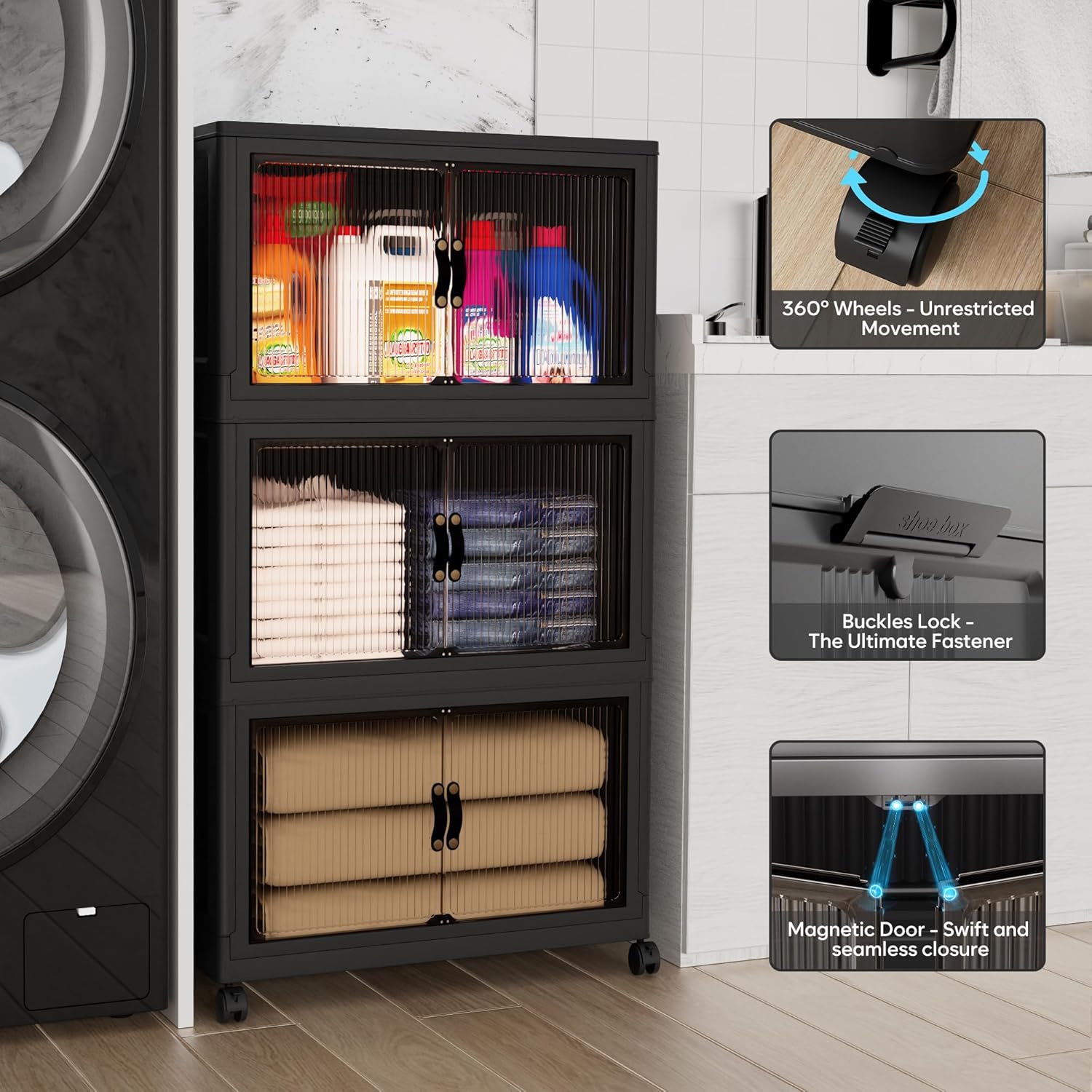 - 【Magnetic Doors & Rotating Wheels】The bins offer two opening options: front or top. The magnetic closure allows easy access. The 4 rotating 360-degree wheels make them easy to move, ideal for use in storage and organization in any room like your closet or bathroom.